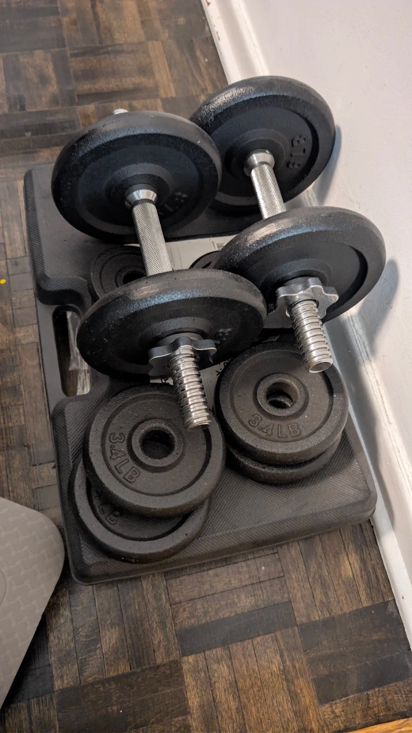 Two adjustable dumbbells with multiple weight plates. Has pair of 1.1, 3.4 and 6 lb plates. Includes a black storage tray. Weights are black with silver handles.