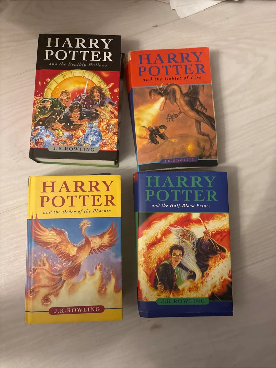 Set of four Harry Potter books by J.K. Rowling. Includes 'Harry Potter and the Deathly Hallows', 'Harry Potter and the Goblet of Fire', 'Harry Potter and the Order of the Phoenix', and 'Harry Potter and the Half-Blood Prince'. These are paperbacks perfect for any fan looking to dive into the series! 40$ FOR ALL OBO