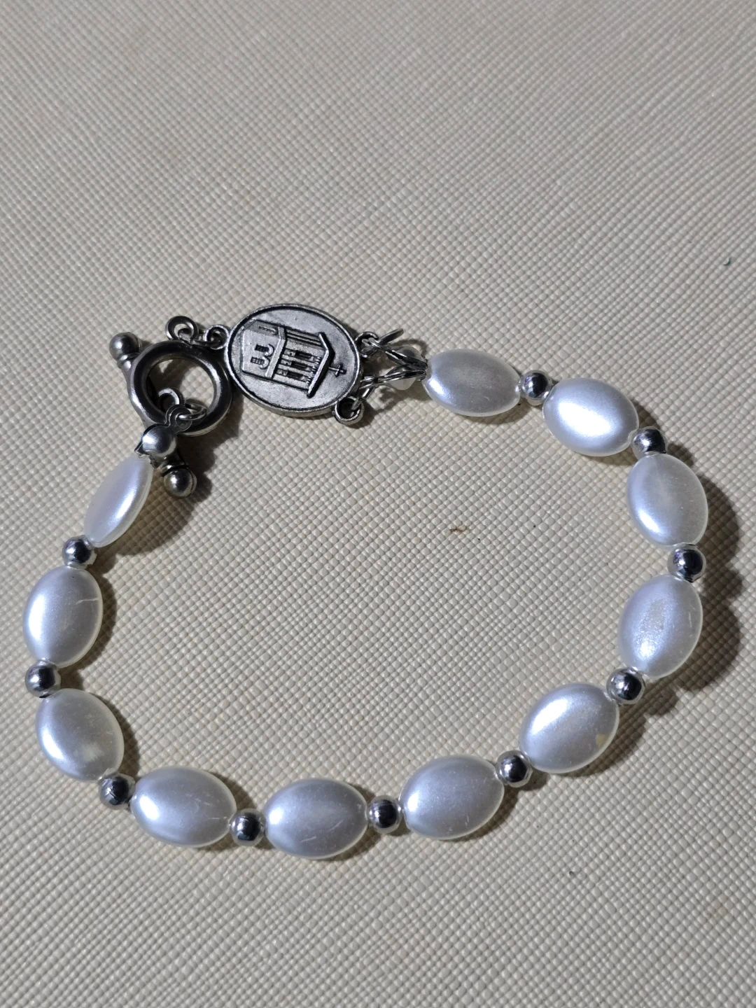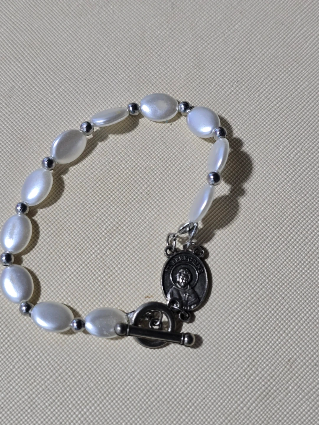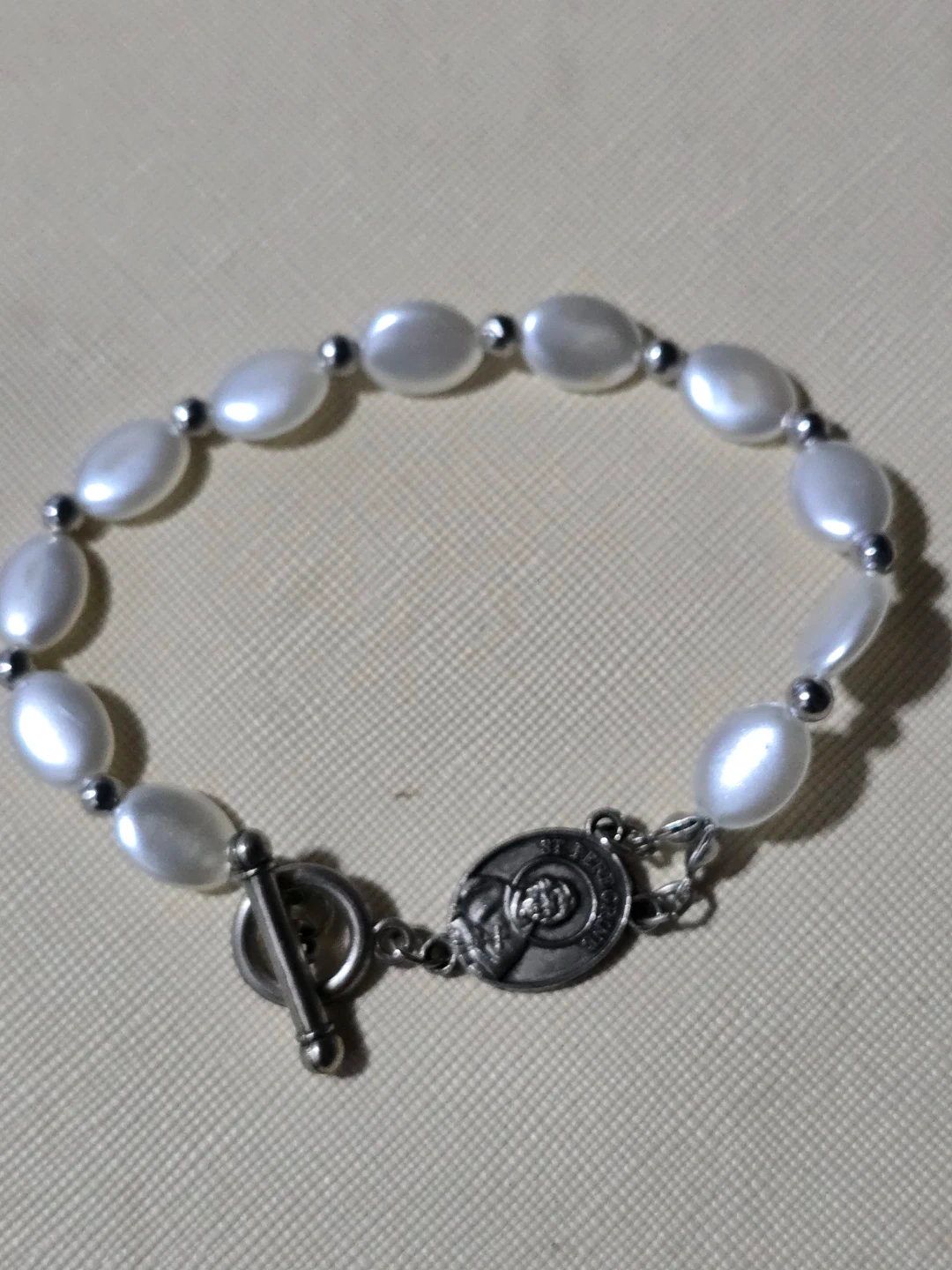 This bracelet features oval faux pearl beads and small silver-tone spacer beads. It's accented with a St. Christopher medal and a toggle clasp. This piece is perfect for everyday wear or as a thoughtful gift!
