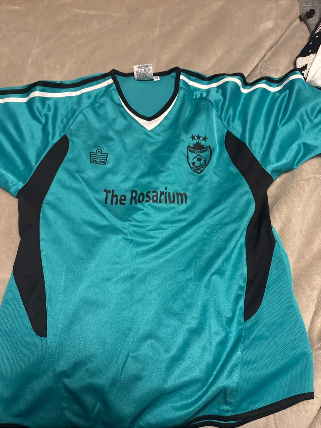 This is an Admiral soccer jersey for Woodbridge The Rosarium. It's a size medium. The jersey is turquoise with black and white accents. Great for playing or cheering on the team!