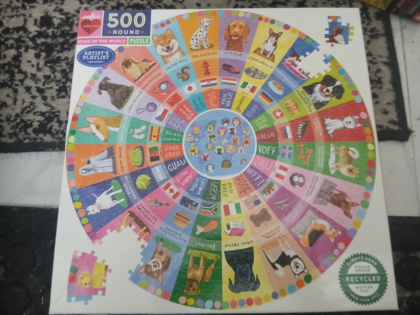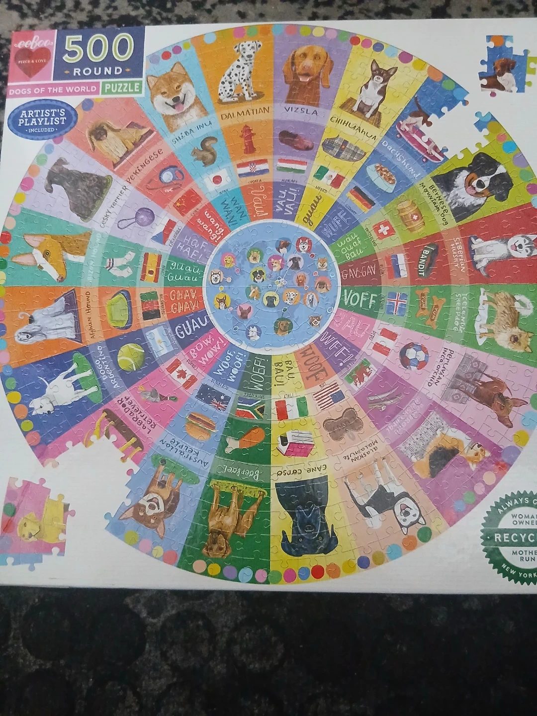 This Ceaco 500-piece round puzzle features "Dogs of the World" and is part of the "Artist's Playlist" collection. It's a fun way to learn dog breeds and their barks from around the globe! This puzzle is great for dog lovers and puzzle enthusiasts alike.