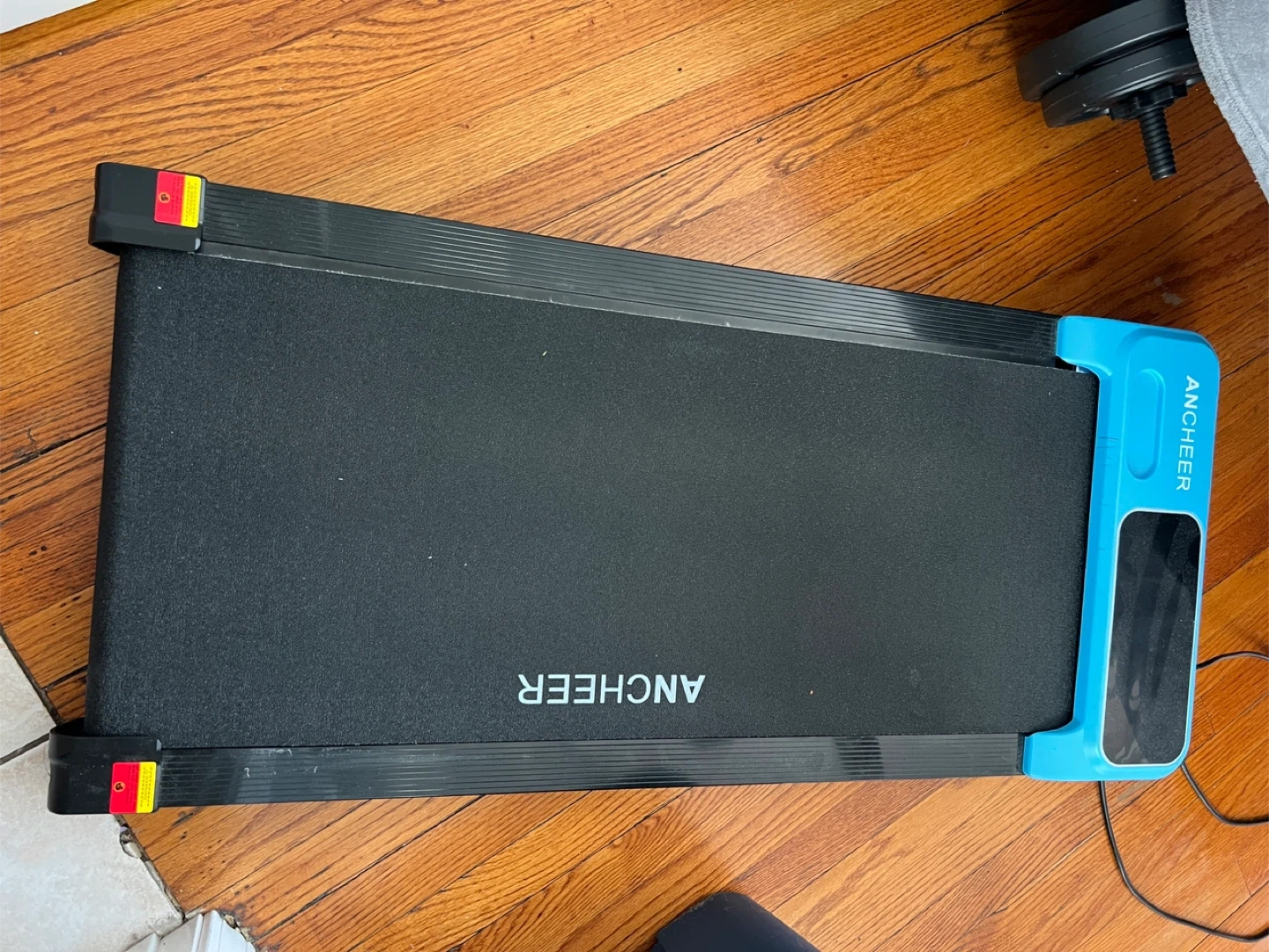 ANCHEE folding treadmill with a black running belt and blue accents. It's compact and designed for walking or light jogging. This treadmill is suitable for home use.