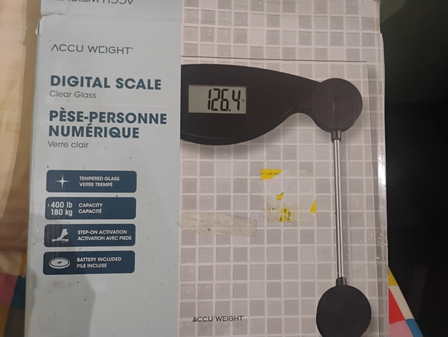 This Accu Weight digital scale features tempered glass. It has a capacity of 400 lb (180 kg) and step-on activation. Battery is included for convenience.