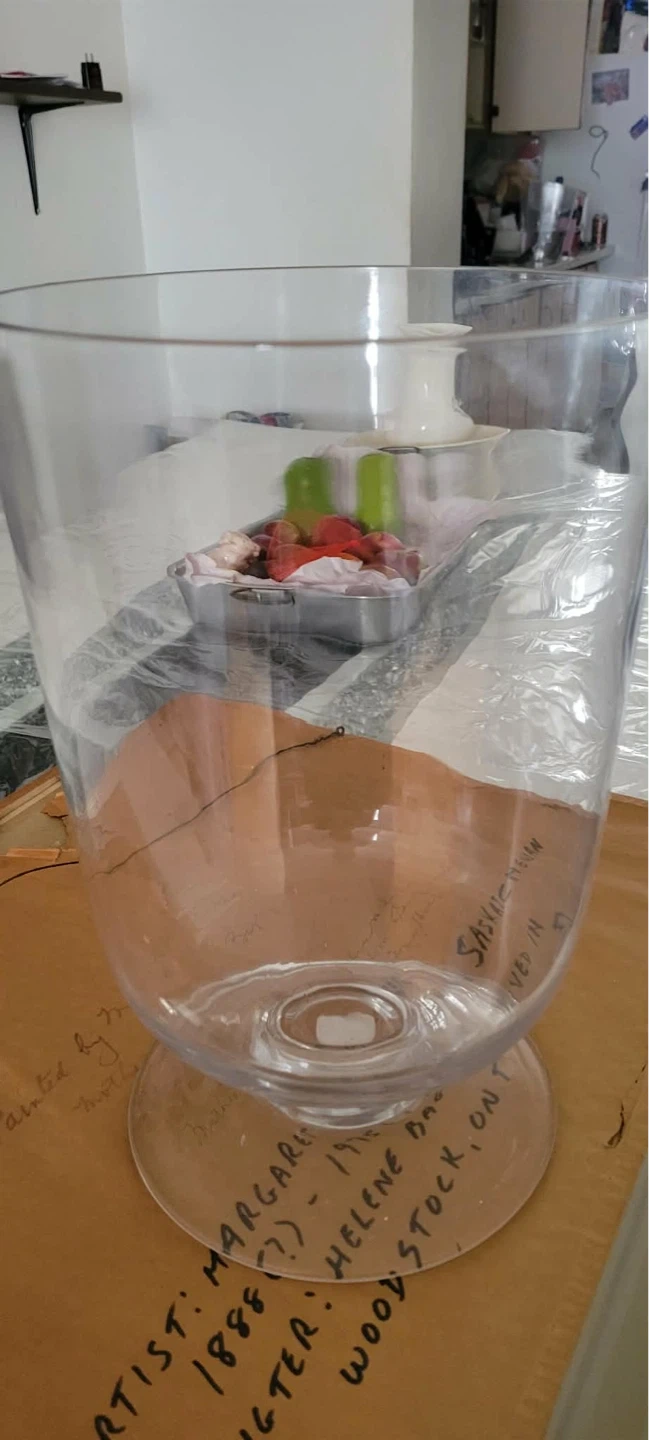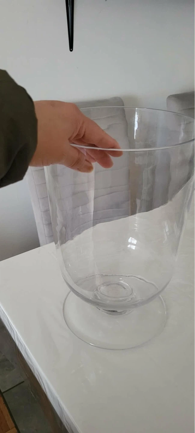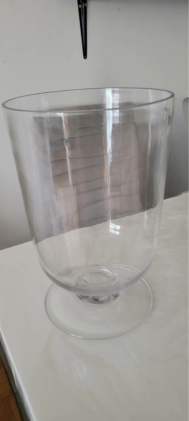 This is a large clear glass vase with a footed base. It's made of clear glass. It could be used for floral arrangements or as a decorative container. It's quite spacious!