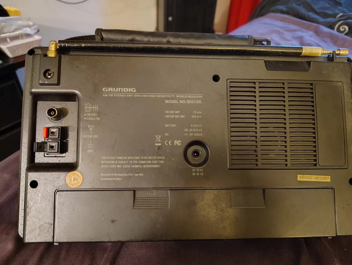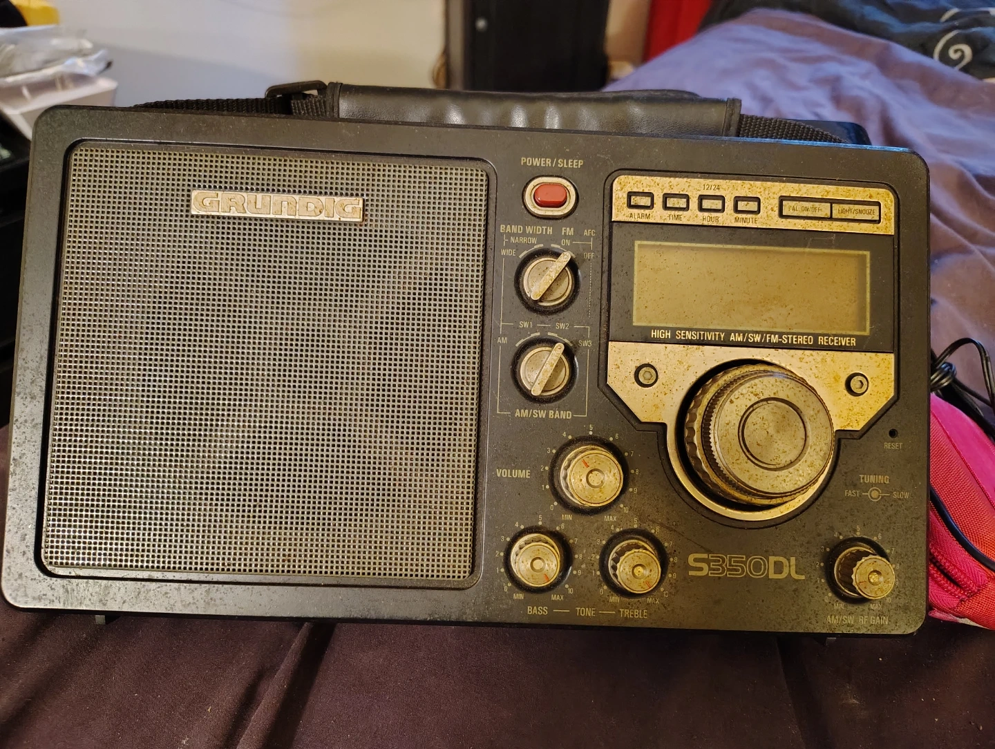 Grundig S350DL high sensitivity world band receiver. This unit picks up AM, FM, SW1, SW2, and SW3 frequencies. It's powered by D-cell batteries or an optional AC adapter. Features include a large tuning knob and separate bass and treble controls.
