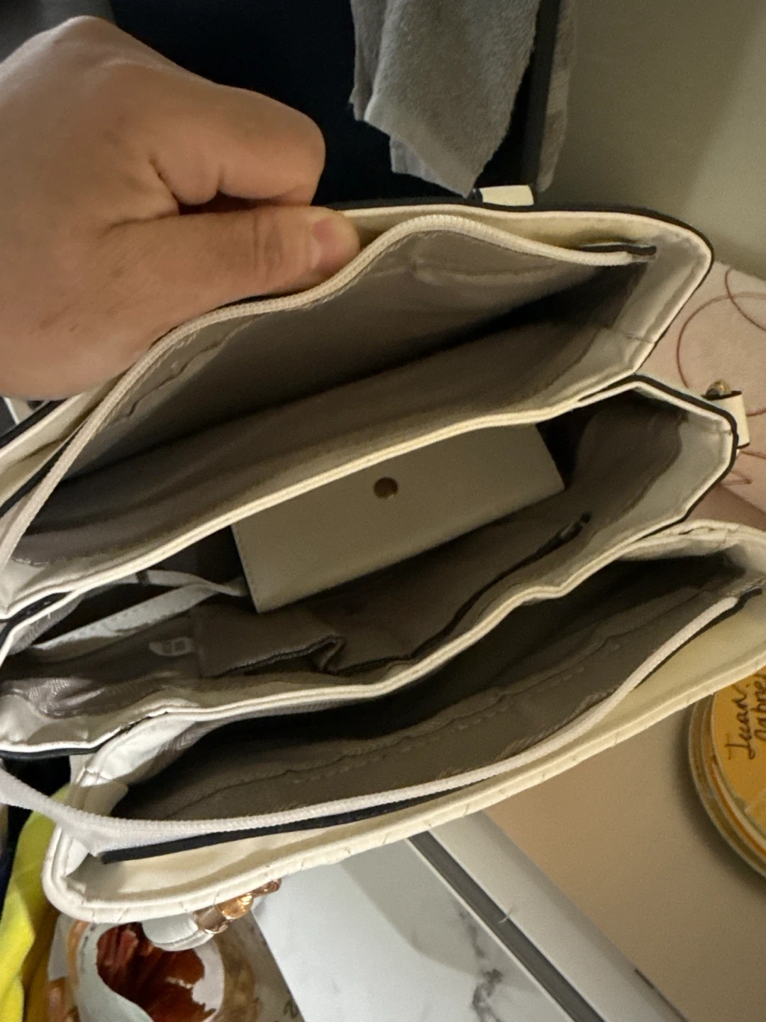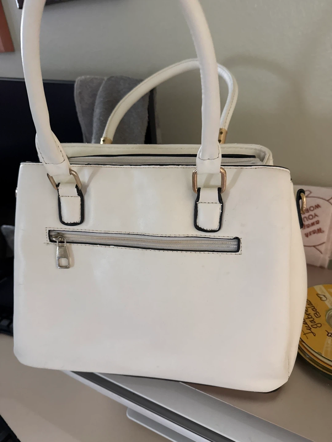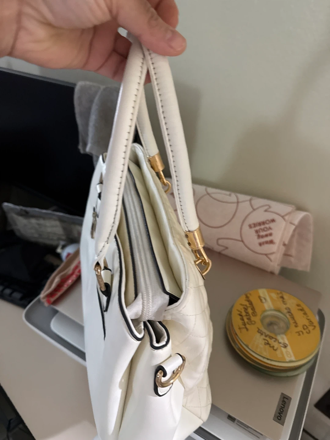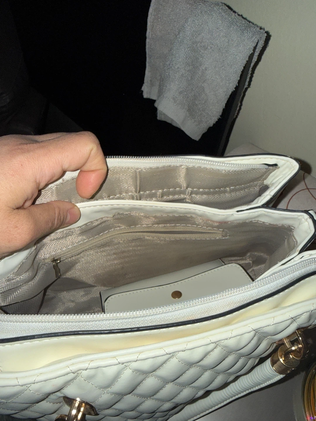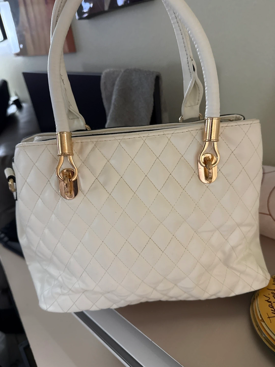 This is a white quilted handbag. It's made of faux leather and has gold-tone hardware. The interior has multiple compartments and a zippered pocket. It includes a small matching clutch.