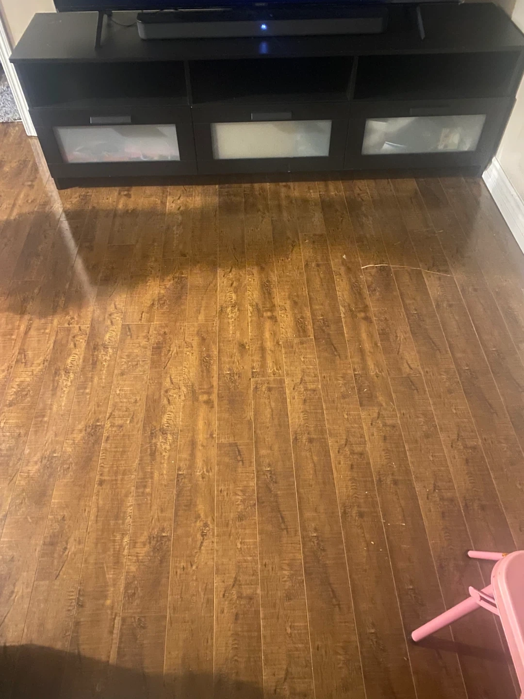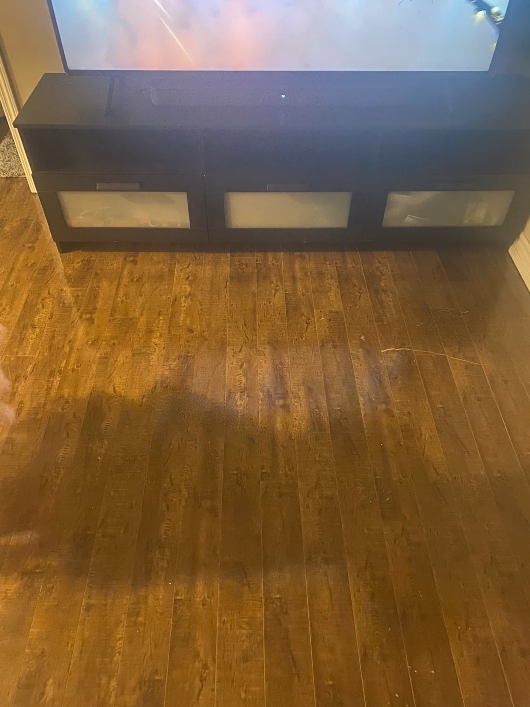 Selling a black TV stand in great condition! It has three compartments with frosted glass doors, perfect for storing media or other items. It's a stylish and functional piece for any living room