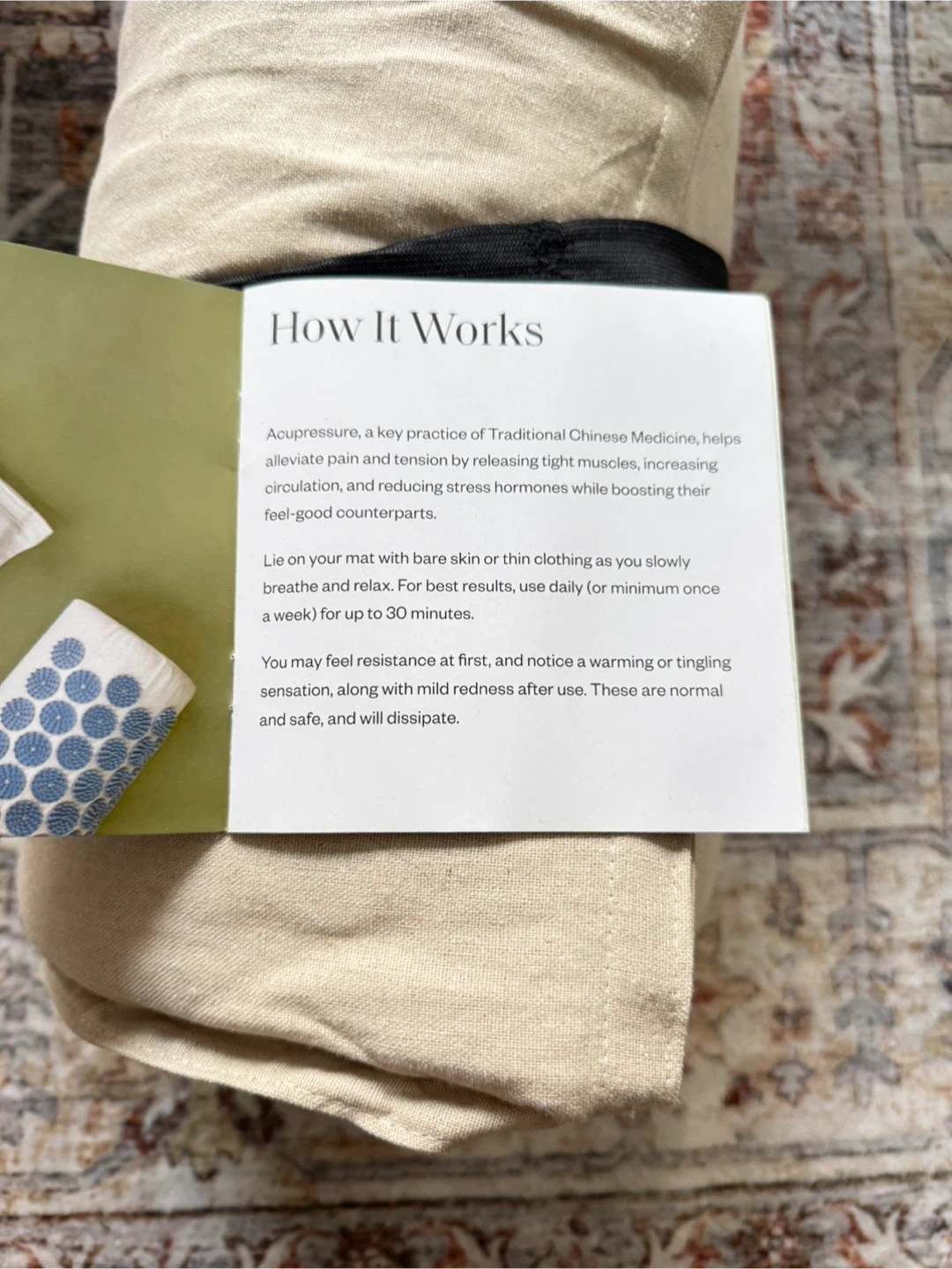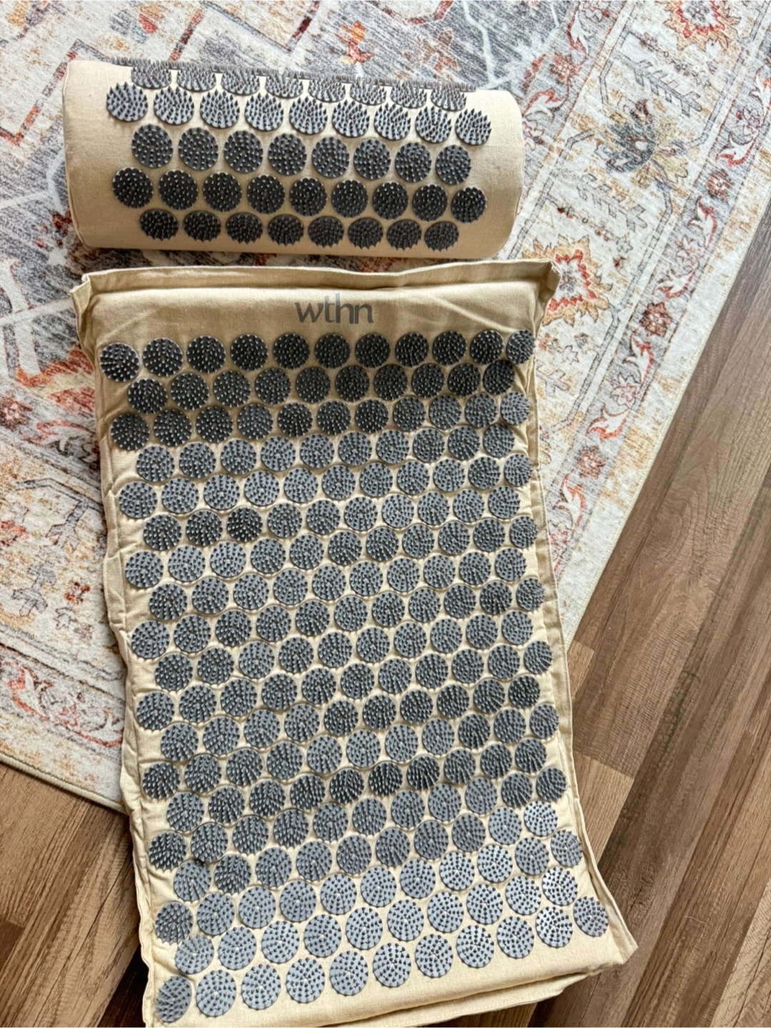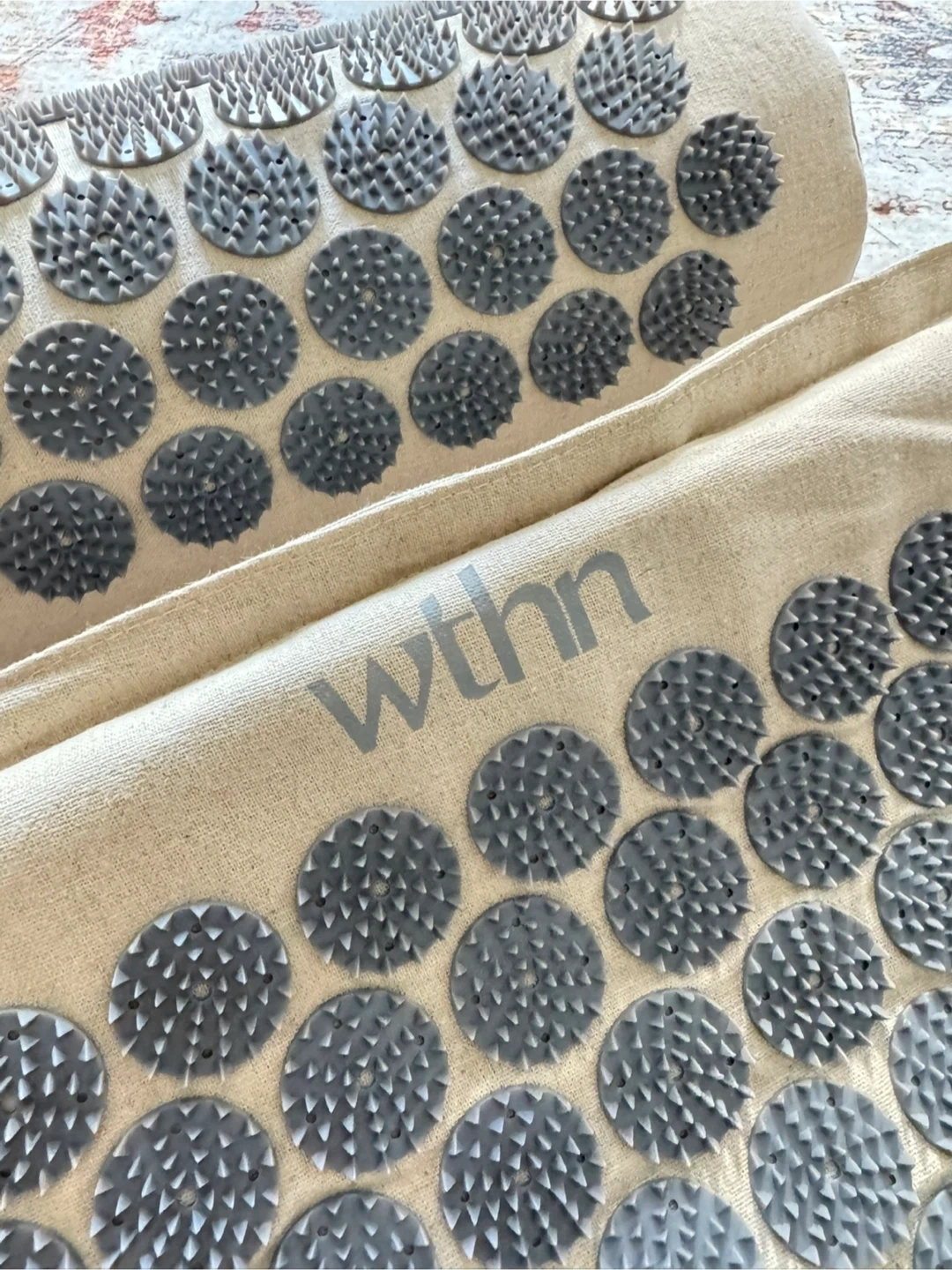 This is a WTHN acupressure mat and pillow set. It comes with the mat, pillow, and carrying bag. It's in great condition and ready to help you relax and relieve tension!