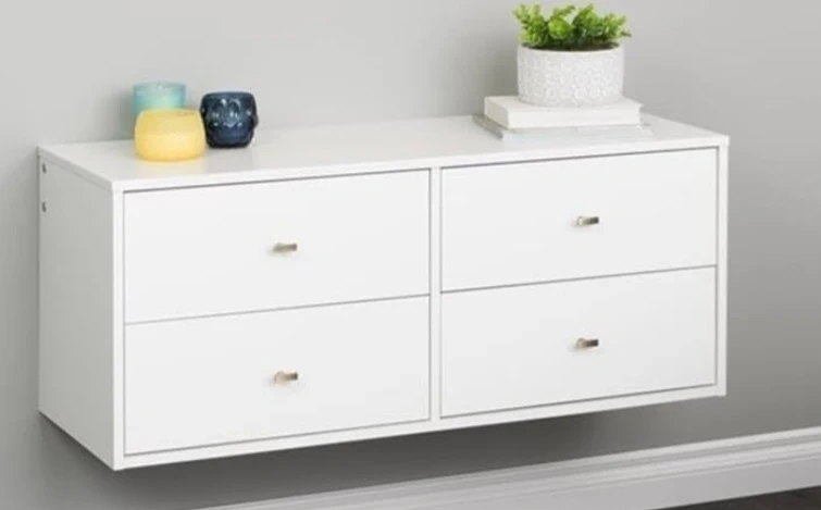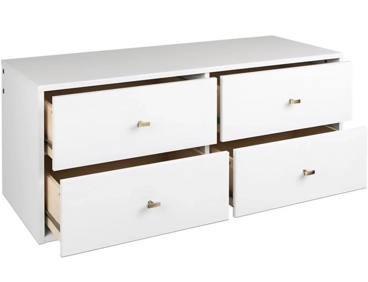 White four-drawer storage unit. This unit features a clean, modern design with gold-toned drawer pulls. It's perfect for organizing various items in a bedroom, closet, or living space. Dimensions: 30" W x 14" D x 18" H. Es aéreo y tiene 6 meses de uso