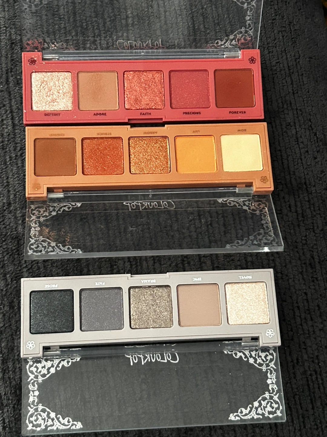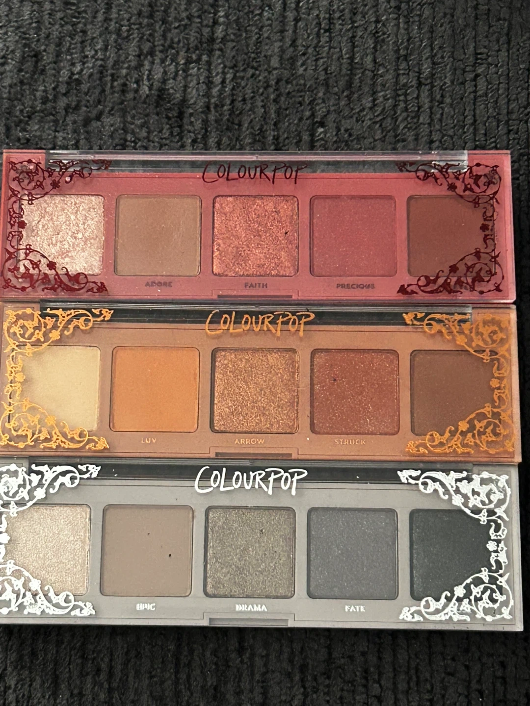 Three ColourPop pressed powder eyeshadow palettes: Ballad, Crush, and Cherish. Each palette features five shades with a mix of finishes.