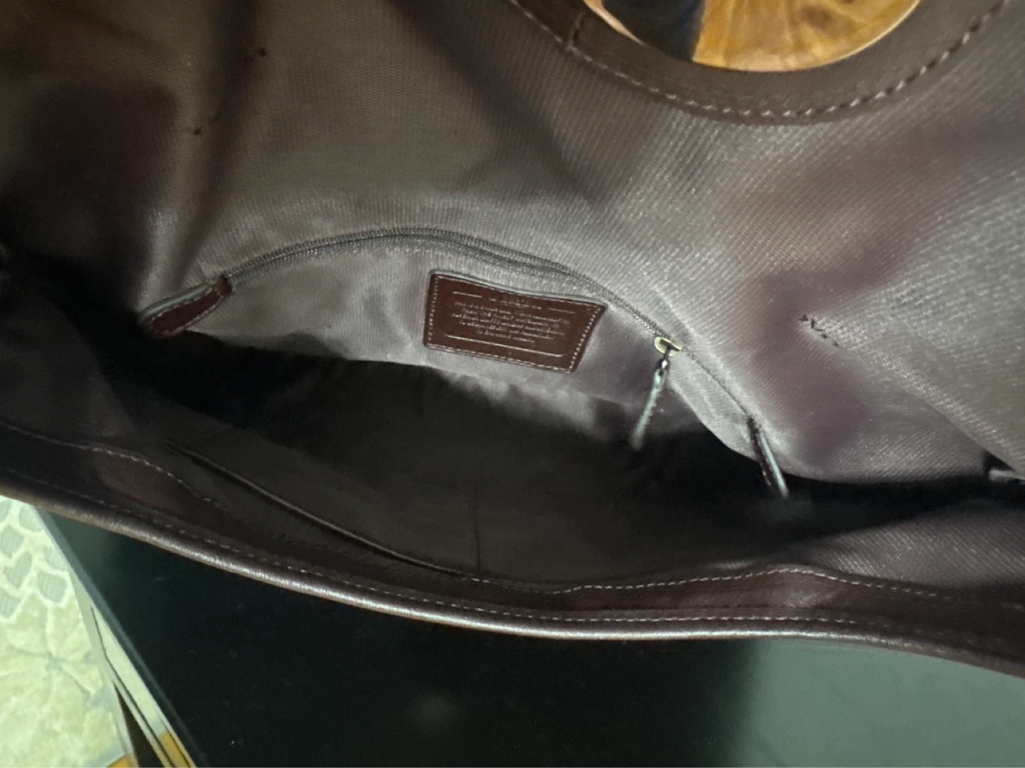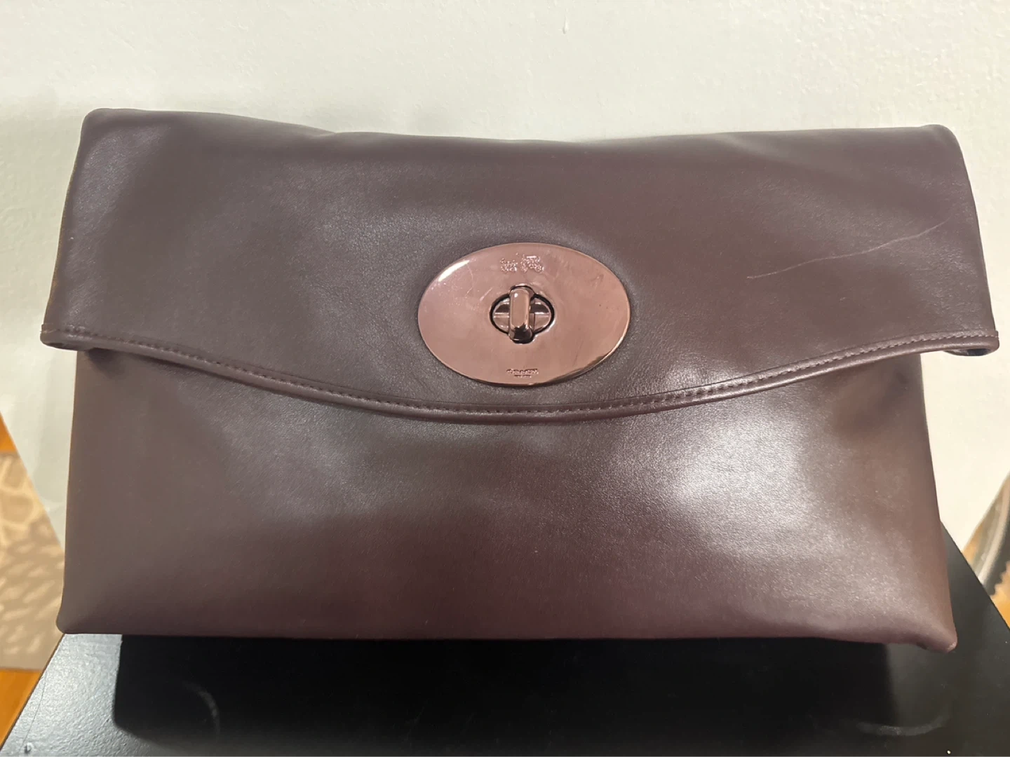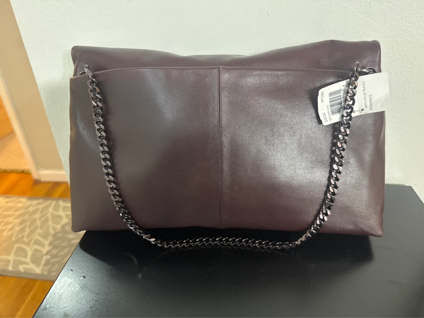 It's a dark brown Coach Pillow Tabby Shoulder Bag 18. Made from soft leather with a turn-lock closure. Includes a gunmetal chain strap. Bag's interior has a zip pocket. Still with tags. Never used.
