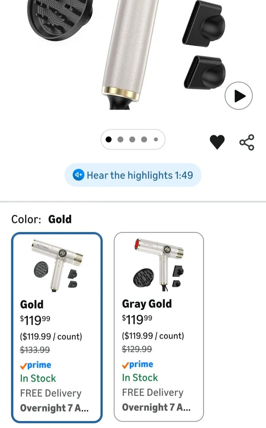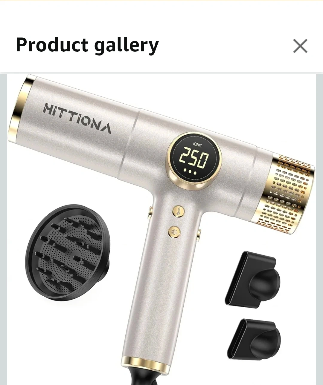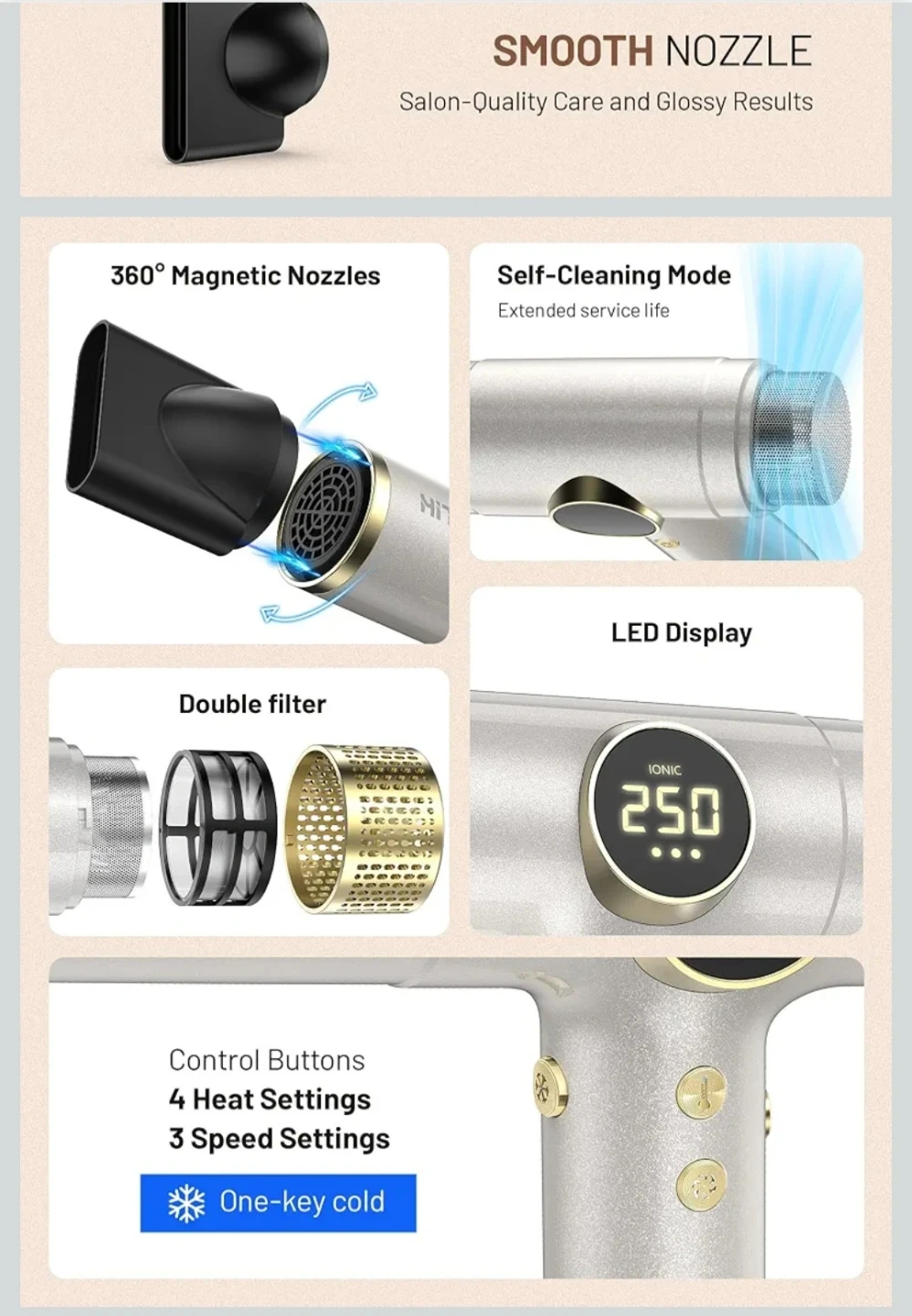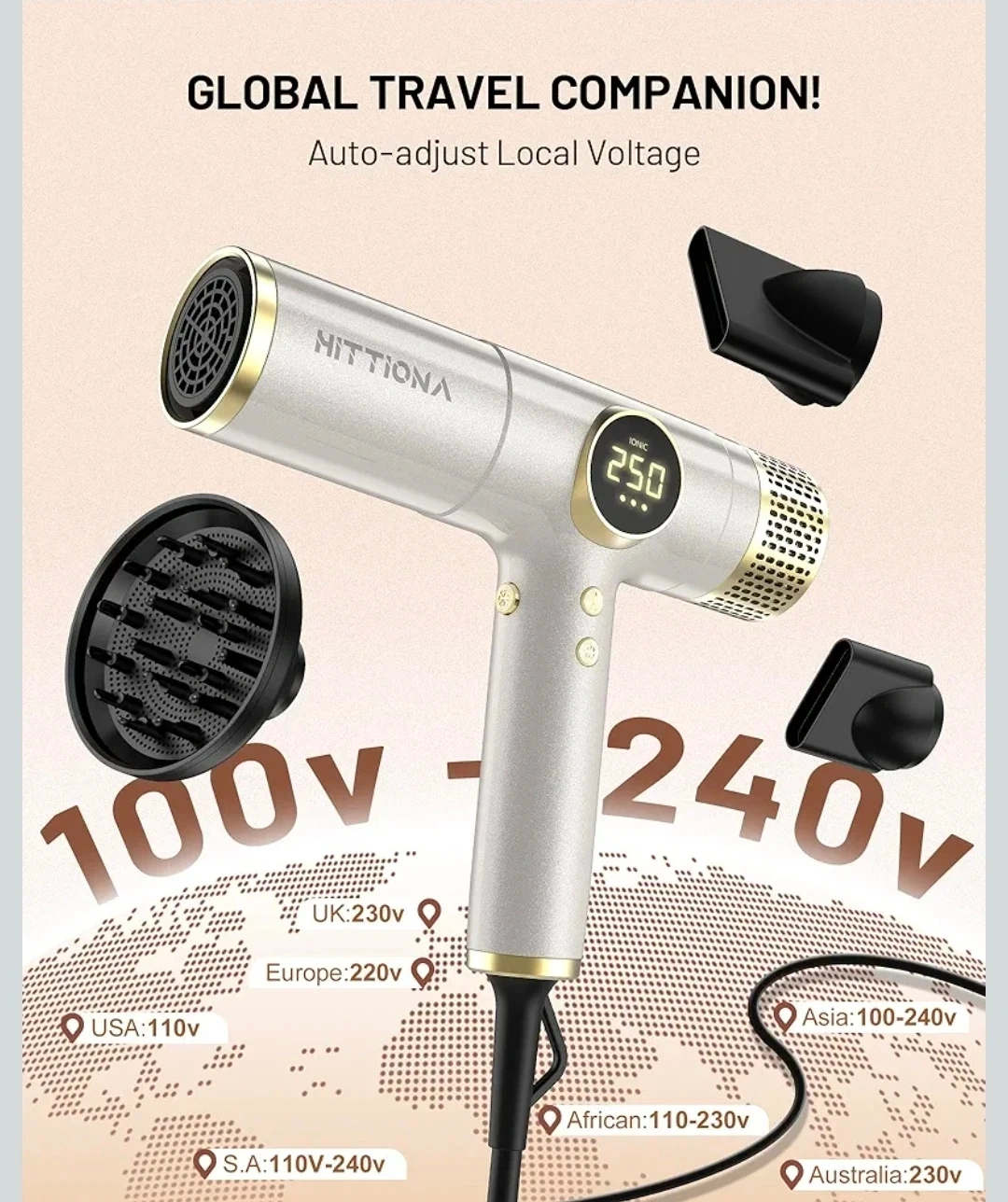 Sealed, unopened box. This HITTIONA ionic hair dryer features 360Β° magnetic nozzles, a double filter, and an LED display. The dryer offers 4 heat settings and 3 speed settings, with a one-key cold shot. Ideal for travel: lightweight and supports different voltage US, EU and others.