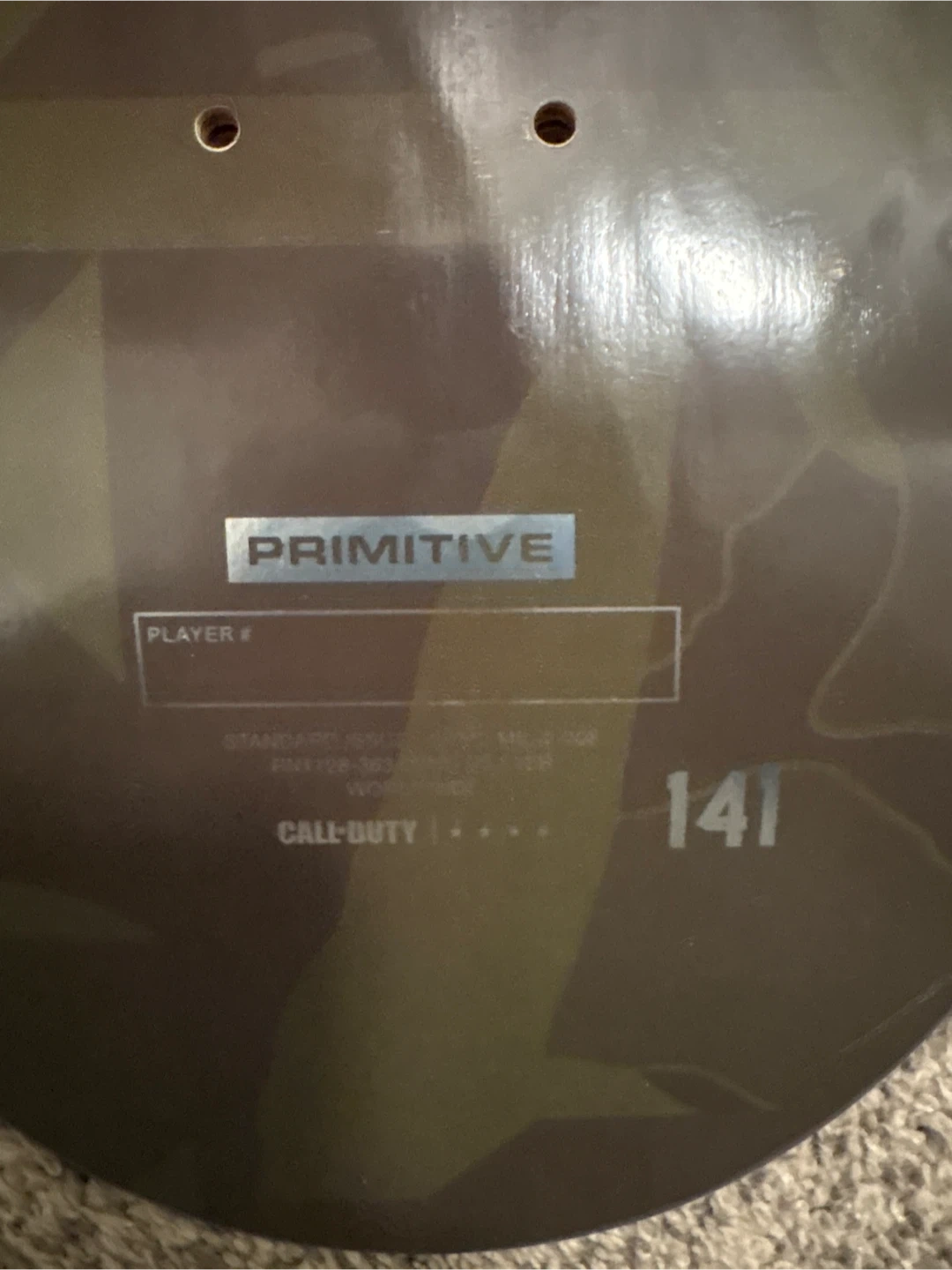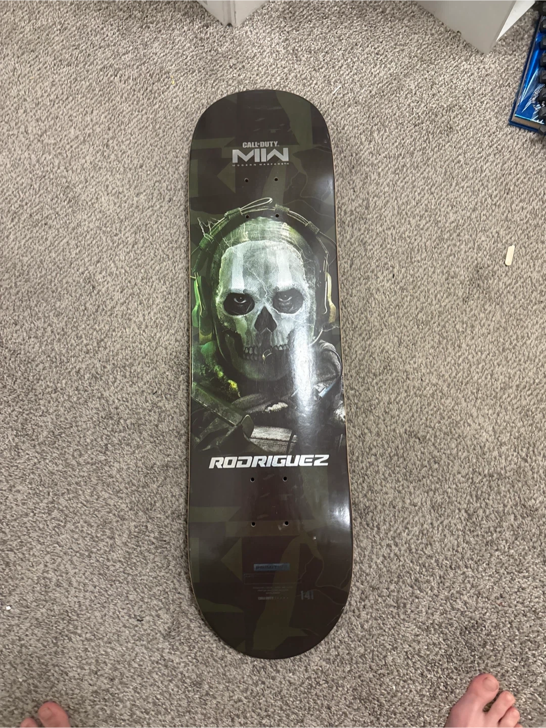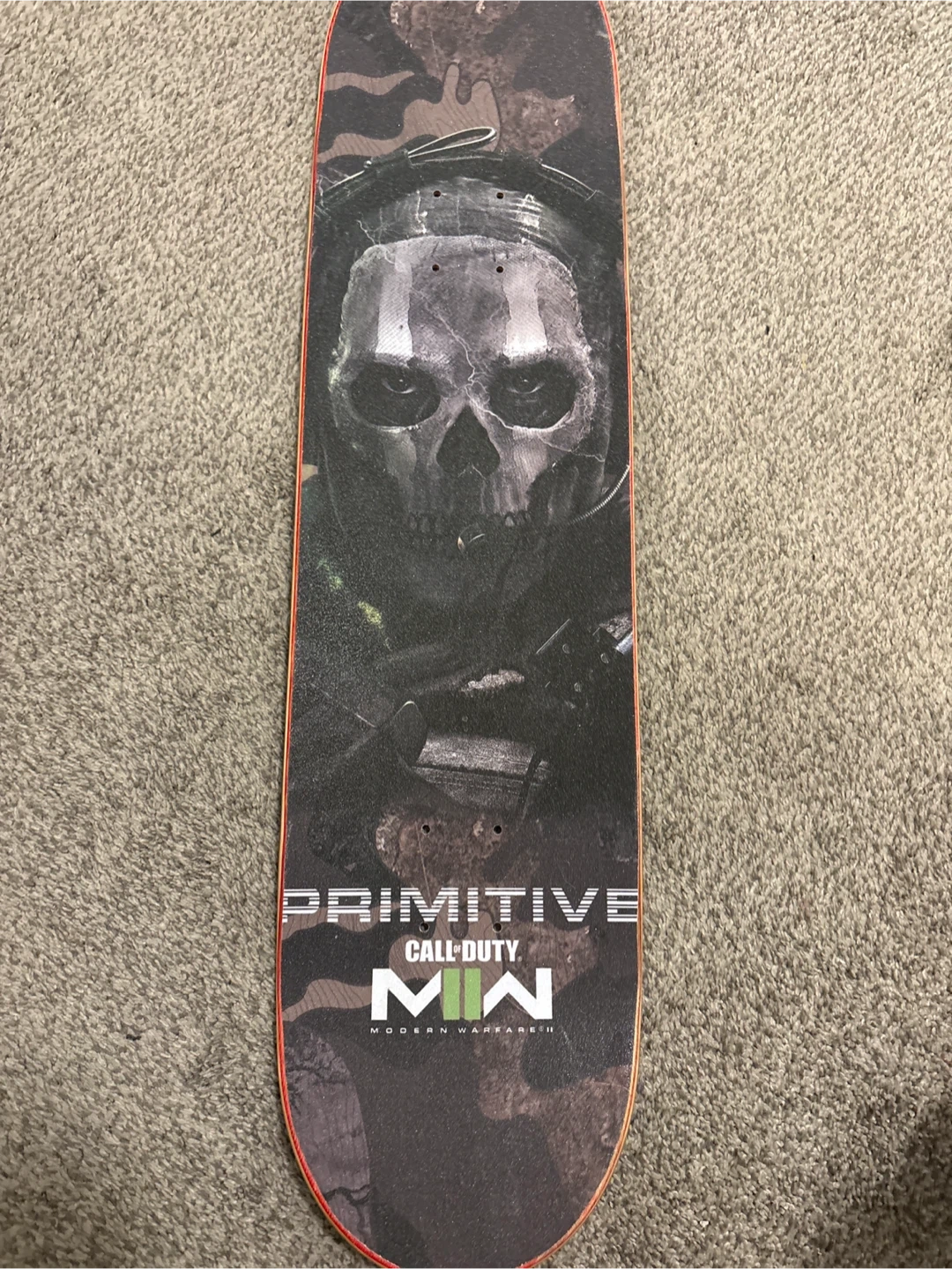 Selling a Primitive skateboard featuring a Call of Duty: Modern Warfare design! It's in great shape and ready for a new owner to shred with. The deck has a cool graphic of Ghost and the iconic MW logo. Perfect for any COD fan or skater!