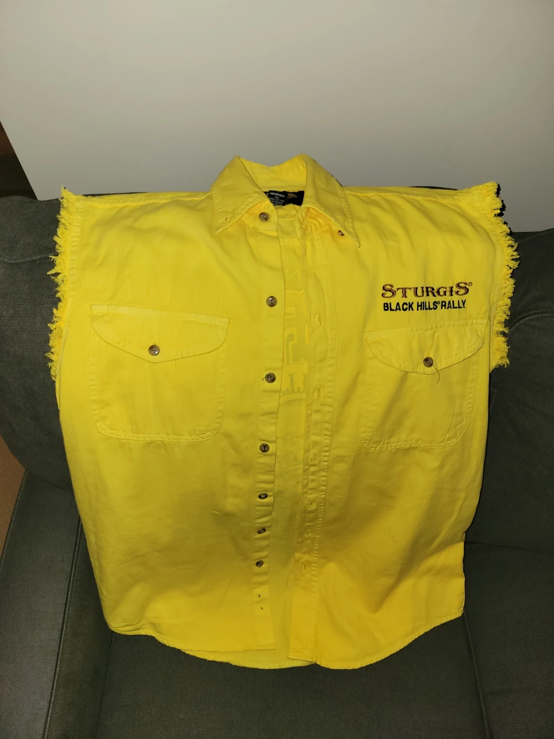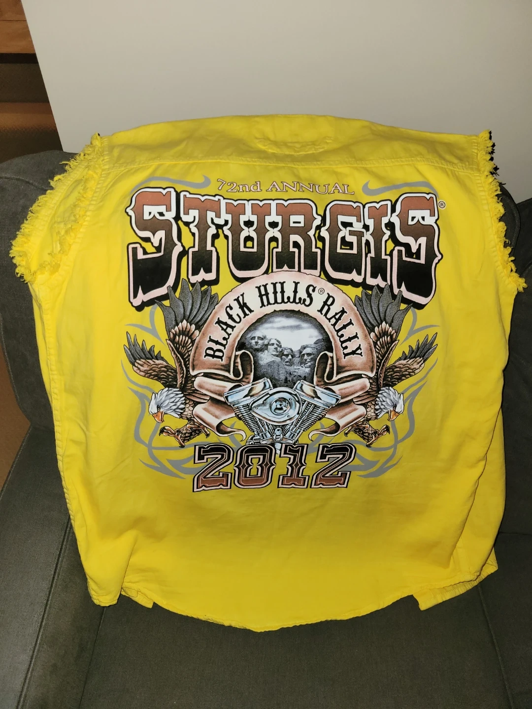 This item is a sleeveless button up from the 72nd Annual Sturgis Black Hills Rally, which took place in 2012 in South Dakota. The graphic prominently features an eagle and the event year and title. Event Details Event: Sturgis Black Hills Rally, a famous annual motorcycle rally held in Sturgis, South Dakota. Year/Anniversary: The 72nd Annual Rally was held in 2012. Dates: Harley-Davidson's official events ran from August 4 to August 11, 2012. Other related events began as early as July 18. This was purchased in South Dakota in 2012. Brand new, never worn.