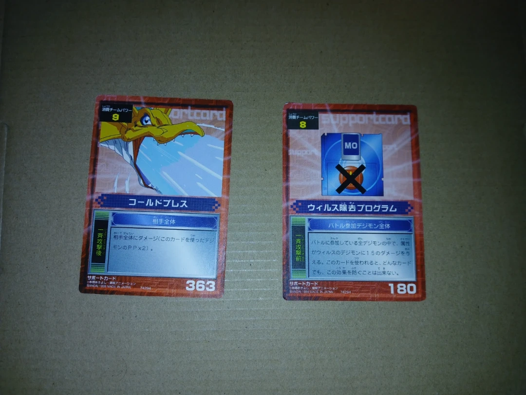 This listing includes two Digimon Card Tactics support cards. One card features 'Cold Breath' with support power 9. The other card is 'Virus Program' with support power 8. Both cards have the Digimon Adventure logo on the back.
