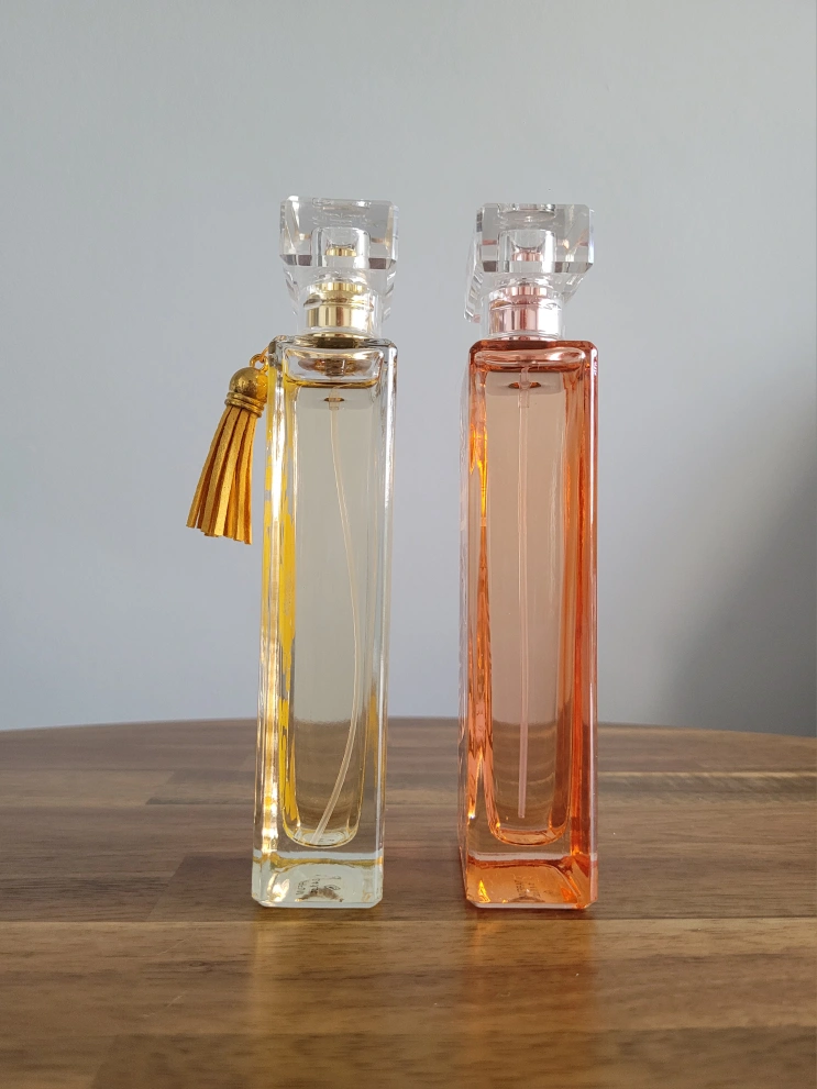 Tall and stately bottles with one-sided floral designs. Everlasting has a tassel.