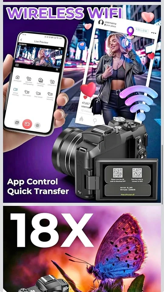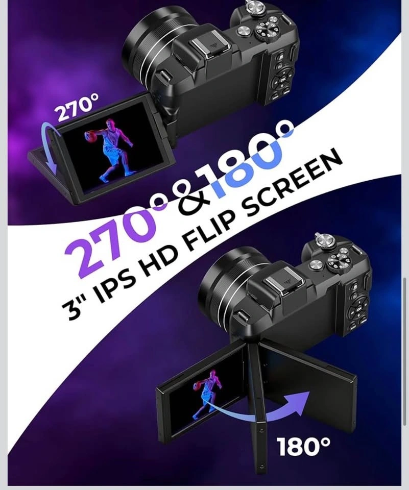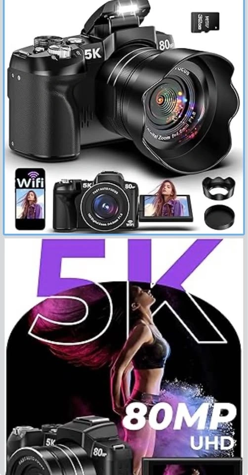 This digital camera supports 5K UHD video recording and 80MP high-resolution photos, capturing vivid details and lifelike clarity. The built-in battery supports 120+ minutes of continuous recording. It features an upgraded fast autofocus system for clear shots within 6.56 ft and instant shutter response. The fill light provides bright photos in low-light conditions. This 5K camera offers 30 creative filters, including black & white, retro negative film, and more. It includes a removable lens hood to reduce stray light and improve image quality. The 3-inch IPS HD screen has a 180° flip and 270° rotation, perfect for selfies and vlogging. Folding the screen inward protects it. With built-in WiFi, you can remotely control shooting and transfer photos/videos to your phone easily. It also functions as a high-quality webcam. Designed with a compact, lightweight body, this travel camera is easy to carry. It comes ready to use with a 32GB Micro SD card, lens hood, lens cap, strap, charging cable, and storage bag. The intuitive button layout makes it simple for beginners. Let me know if you're interested!