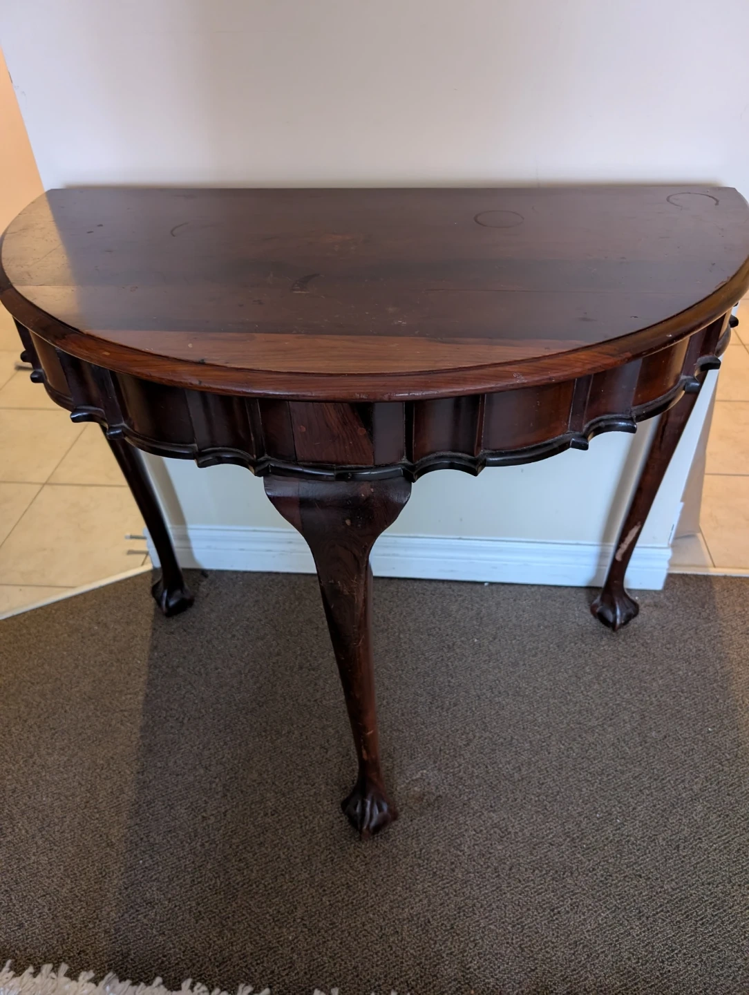 A beautiful antique demilune console table. Features a dark wood finish with ornate carved legs and ball-and-claw feet. This table has a lovely scalloped apron detail.