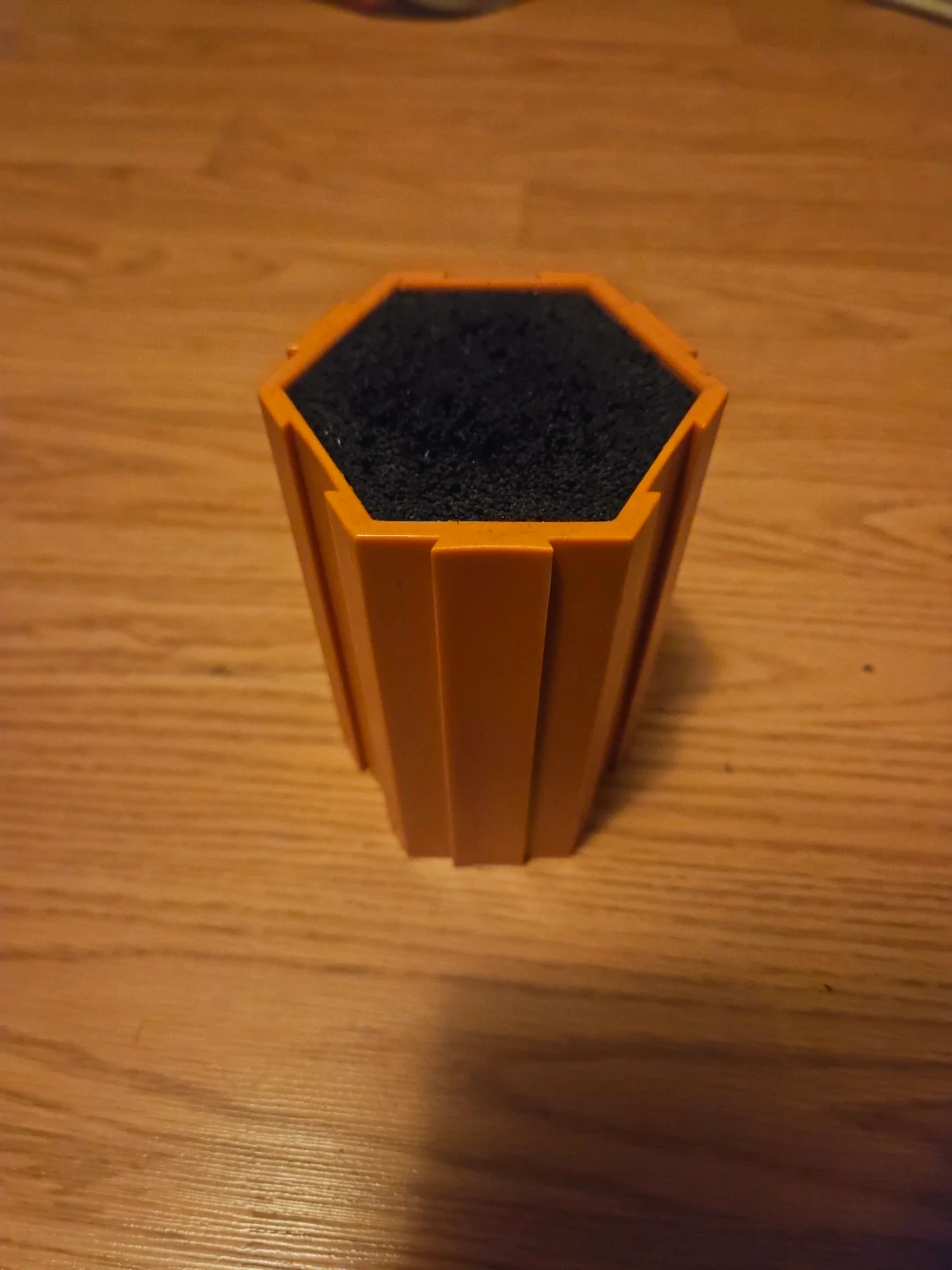 Knife block / holder for smaller kitchen knives. About 6 inches tall and 4 inches wide.