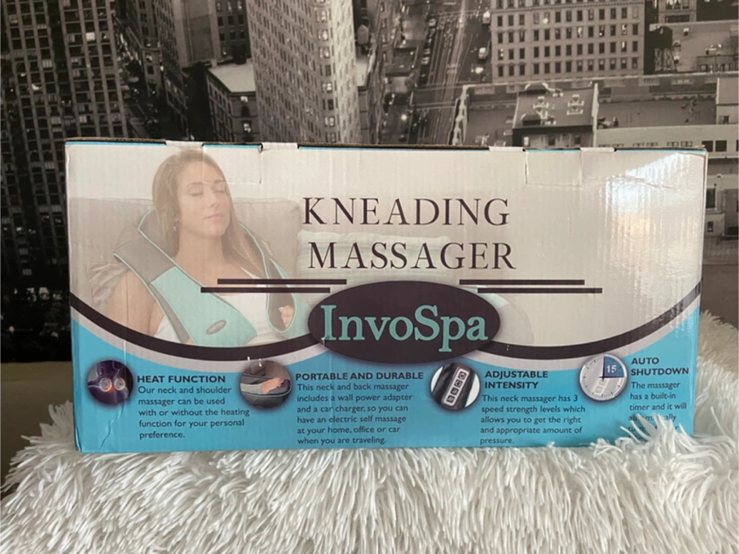 This InvoSpa kneading massager offers heat function and adjustable intensity with 3 speed levels. It's portable and durable, including a wall adapter and car charger for use at home, office, or while traveling. Features an auto shutdown with a 15-minute timer.