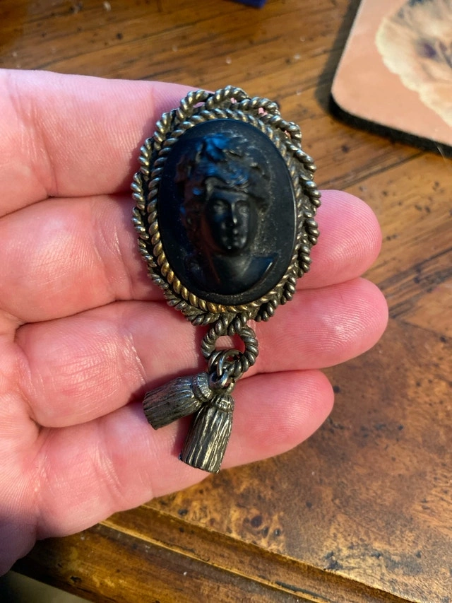 This is a used cameo brooch featuring a detailed profile and tassel accents. A unique piece that adds a touch of vintage charm to any outfit. While I don't know the exact age or history of this brooch, it's in good condition for its age. It's perfect for collectors or anyone who loves vintage jewellery. 2.5” x 1.25”