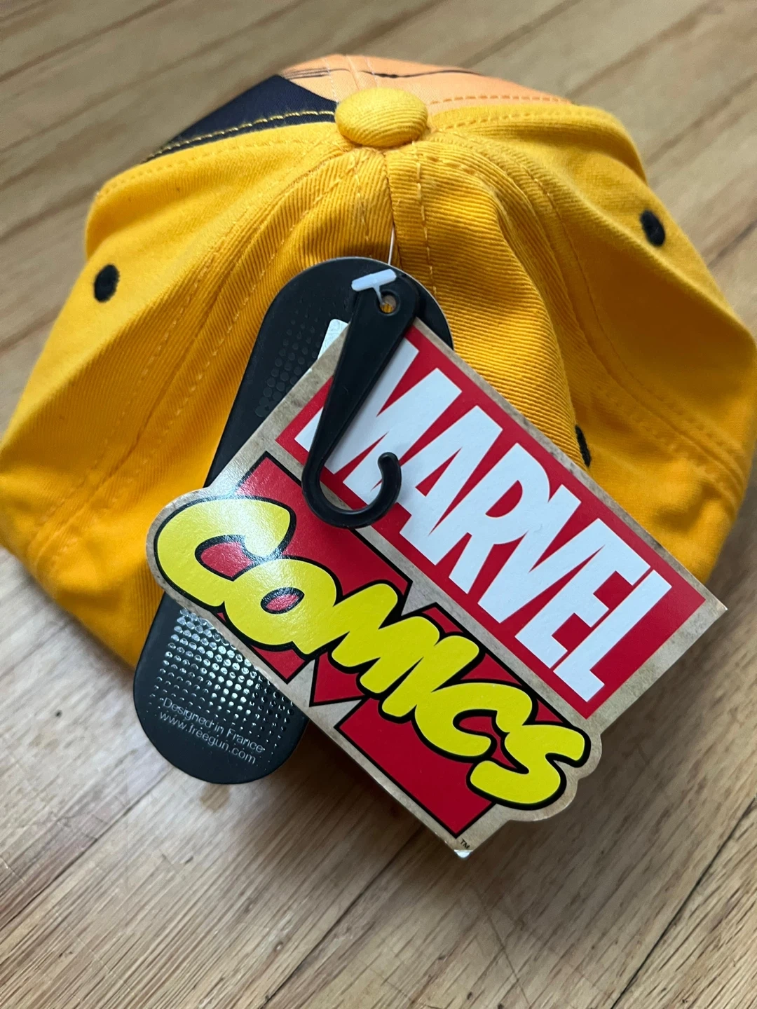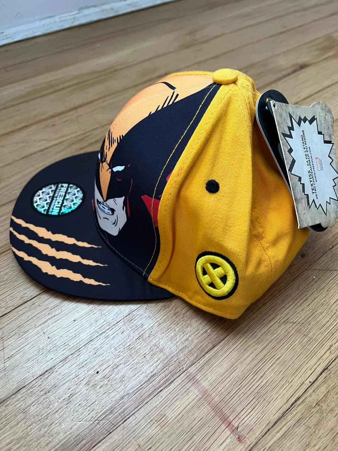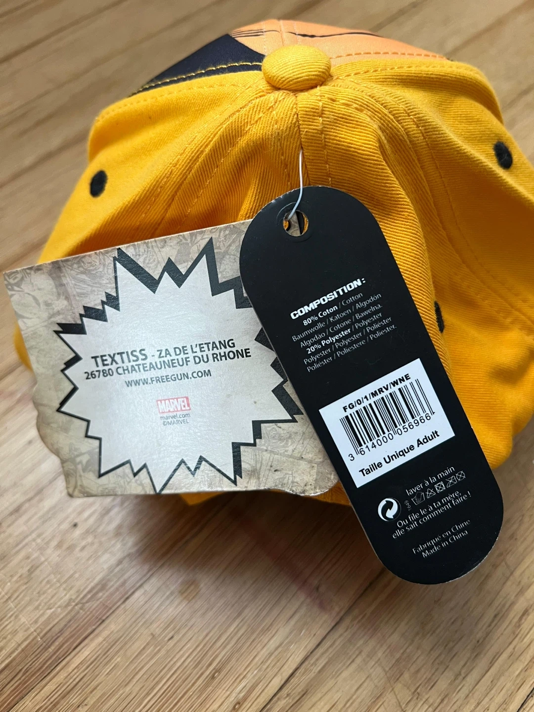 This is a yellow and black Freegun snapback hat featuring Marvel Comics' Wolverine. It's an adult, one-size-fits-all cap. The hat is made of 100% cotton. It's great for fans of Wolverine and Marvel!