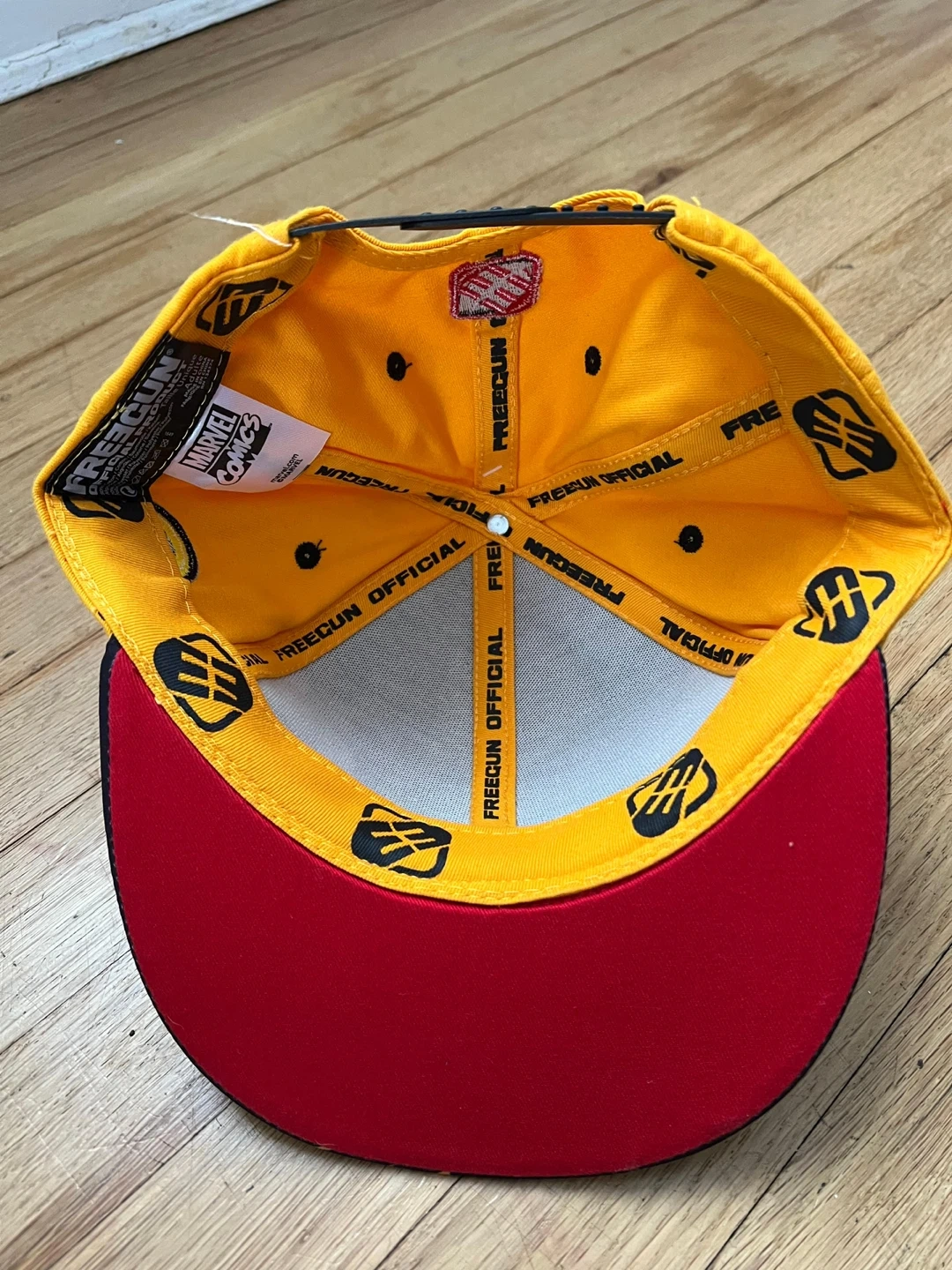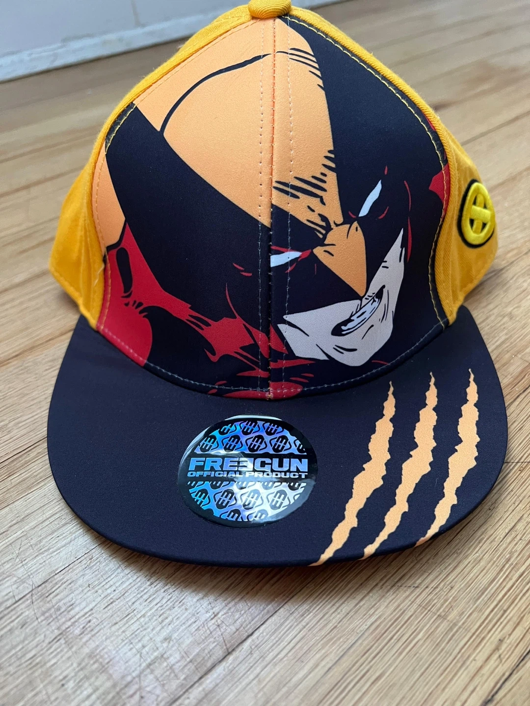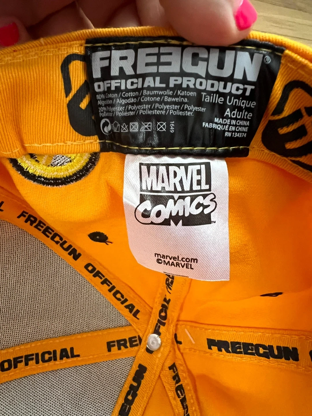 This is a yellow and black Freegun snapback hat featuring Marvel Comics' Wolverine. It's an adult, one-size-fits-all cap. The hat is made of 100% cotton. It's great for fans of Wolverine and Marvel!
