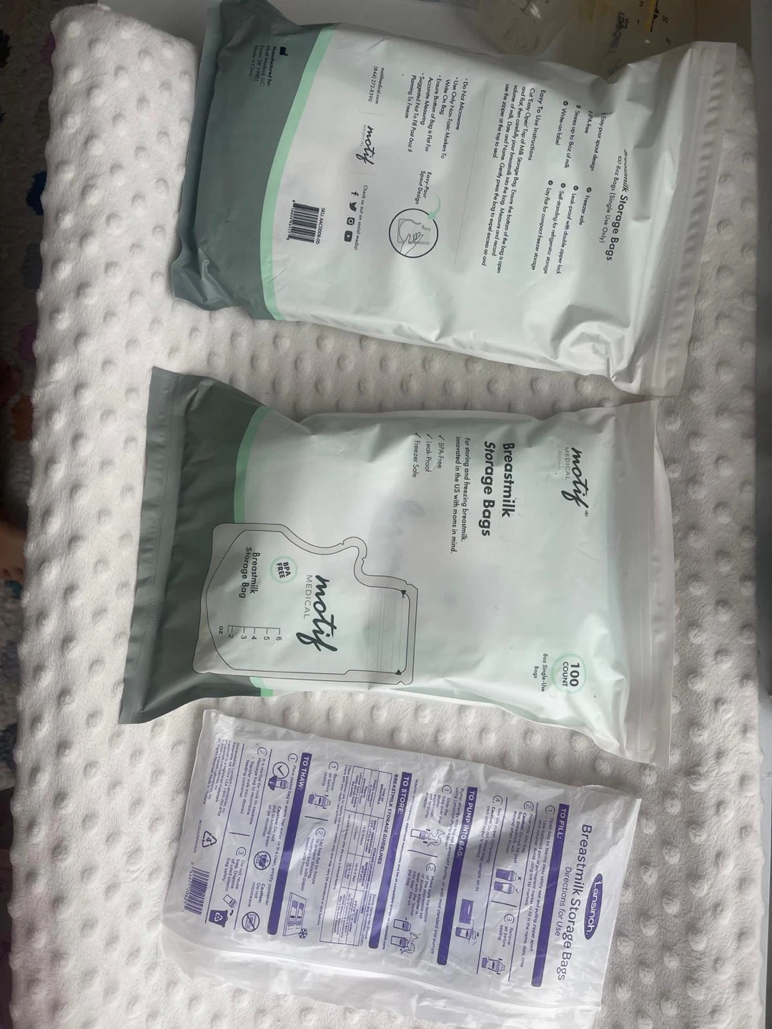 This listing includes two packages of Motif Medical Breastmilk Storage Bags. Each package contains 100 single-use bags, totaling 200 bags. They are BPA-free, leak-proof, freezer safe, and feature an easy-pour spout and write-on label. These bags are designed for storing and freezing breastmilk.