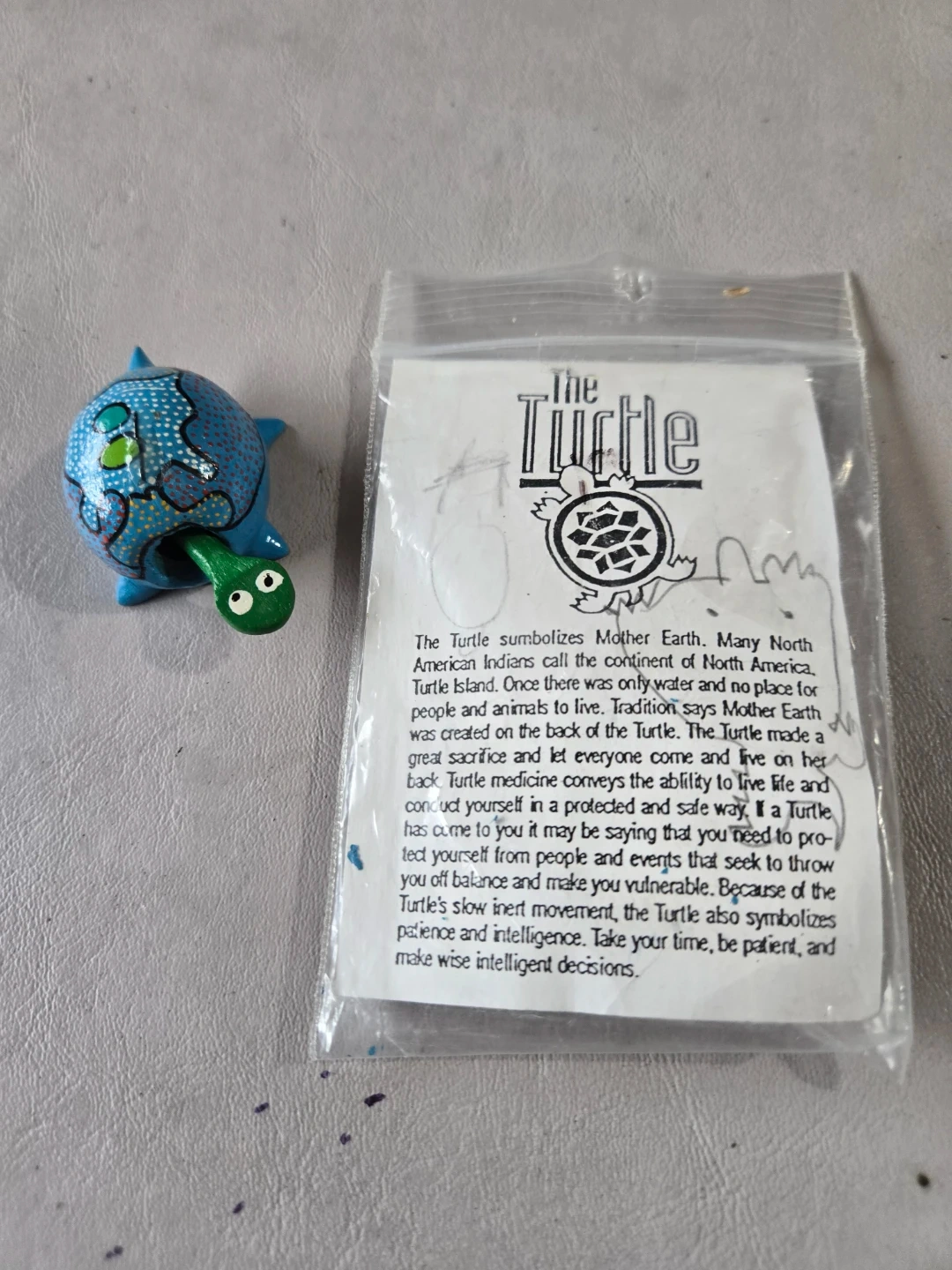 This is a small turtle figurine in a light blue colour with a green head. It comes with a card that explains the turtle's symbolism in Indigenous cultures, representing Mother Earth, patience, and intelligence
