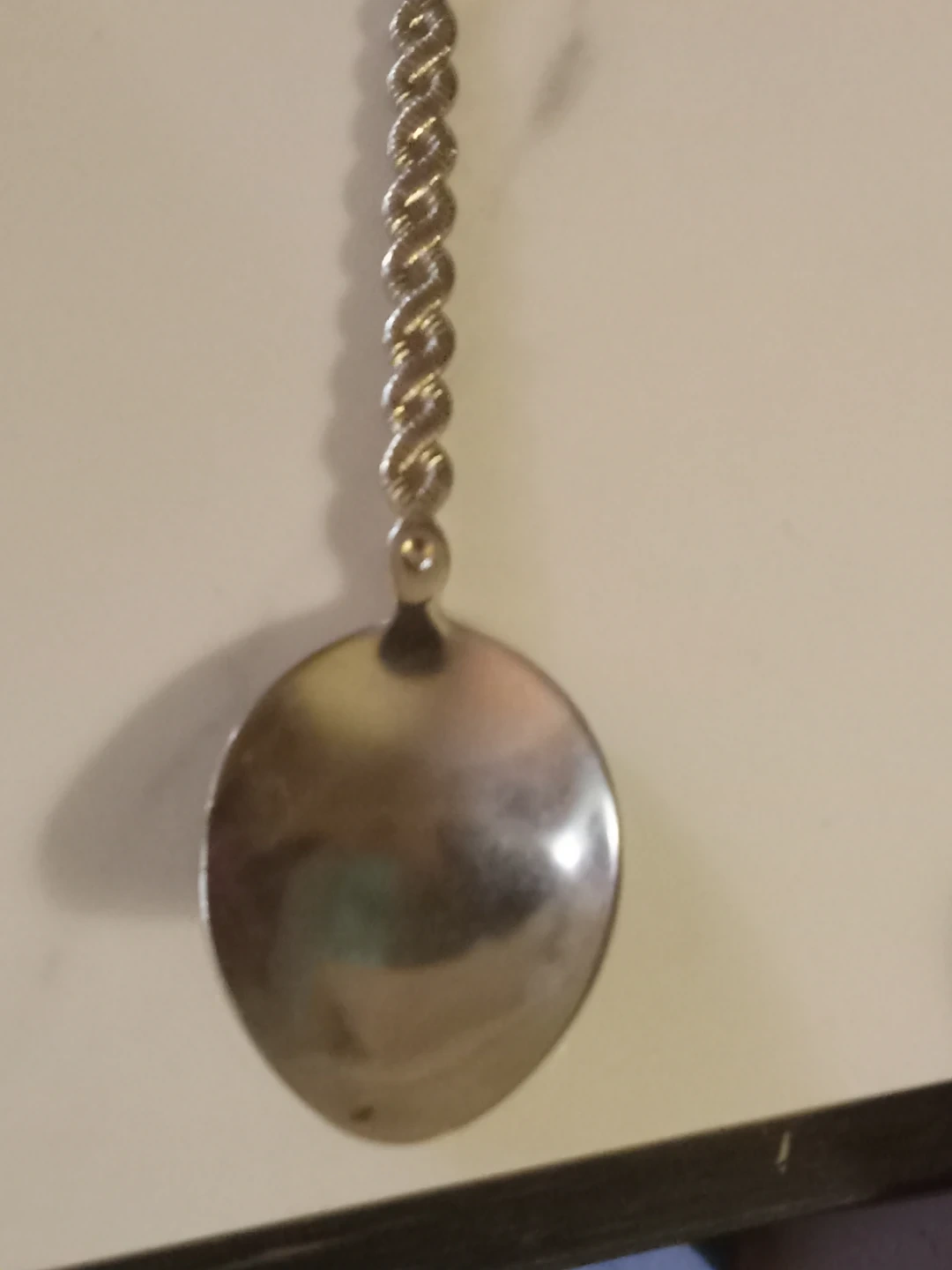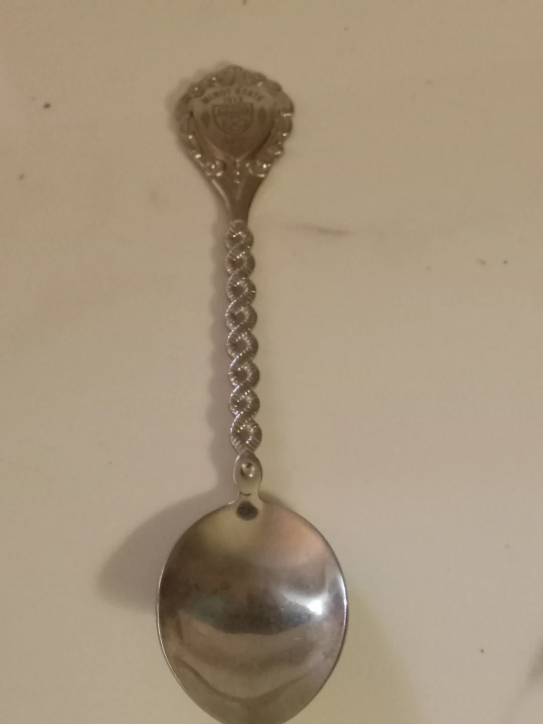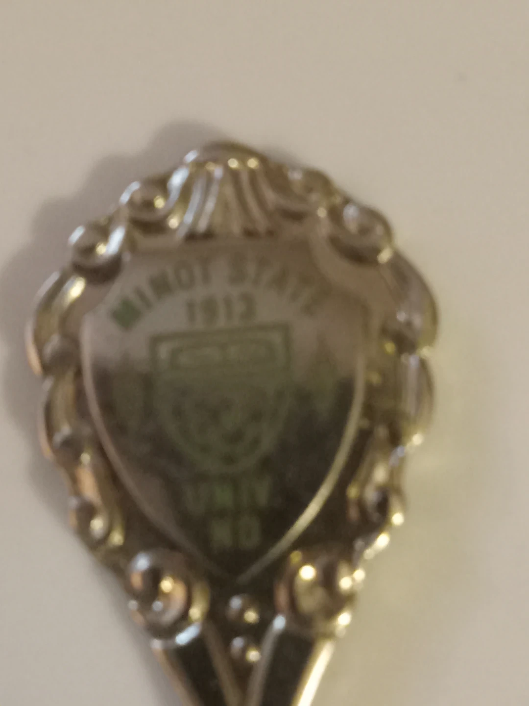 This is a souvenir spoon featuring the Minot State University crest and the year 1913. It has a twisted handle design. Great for collectors or alumni!