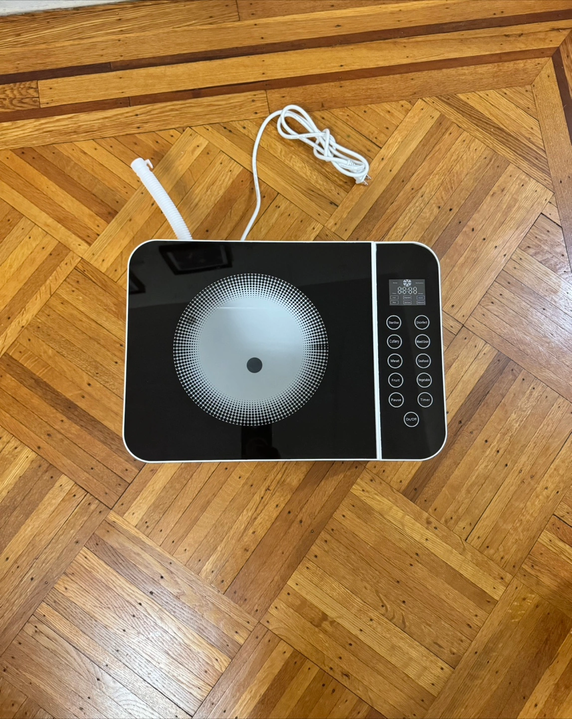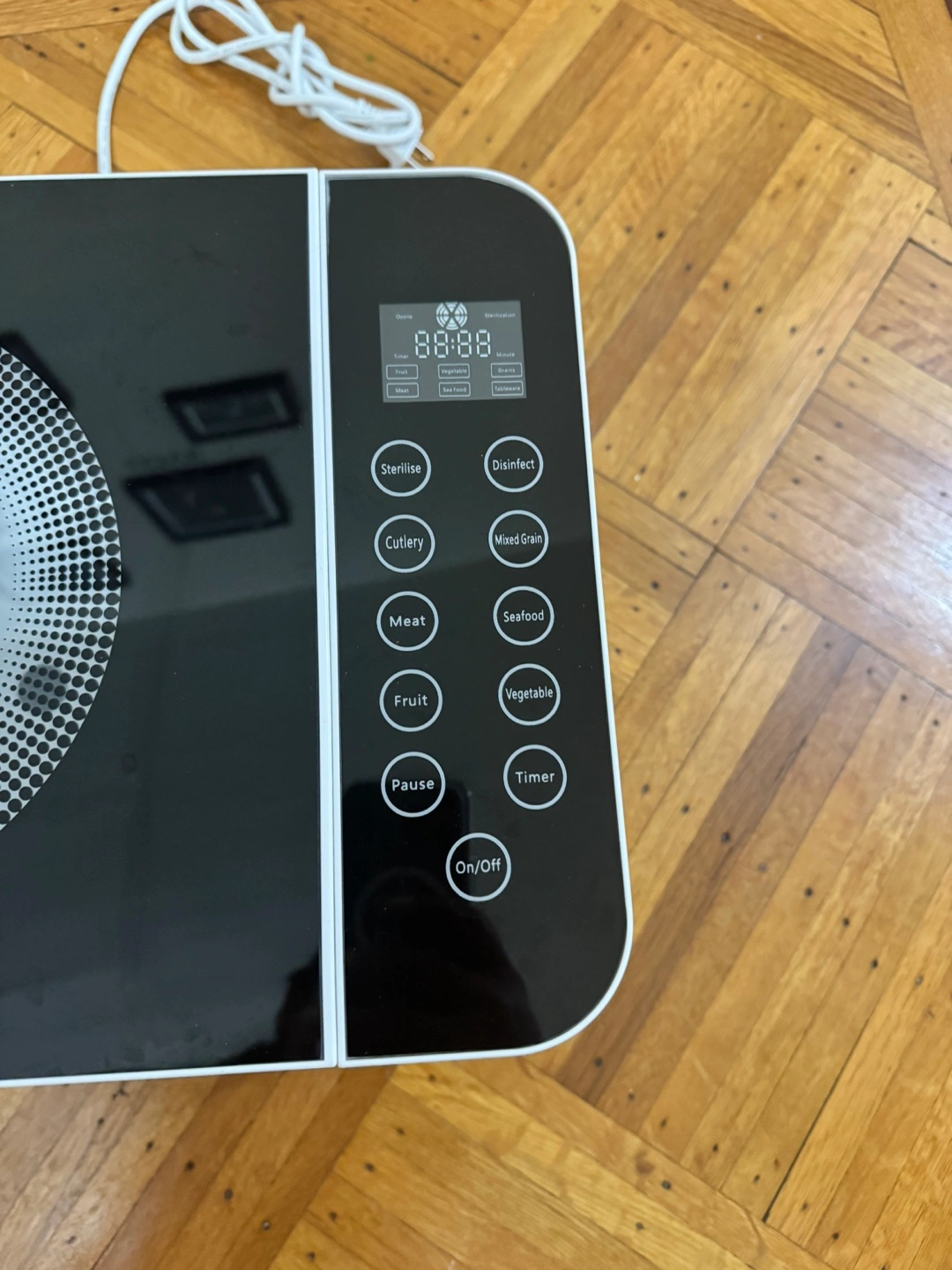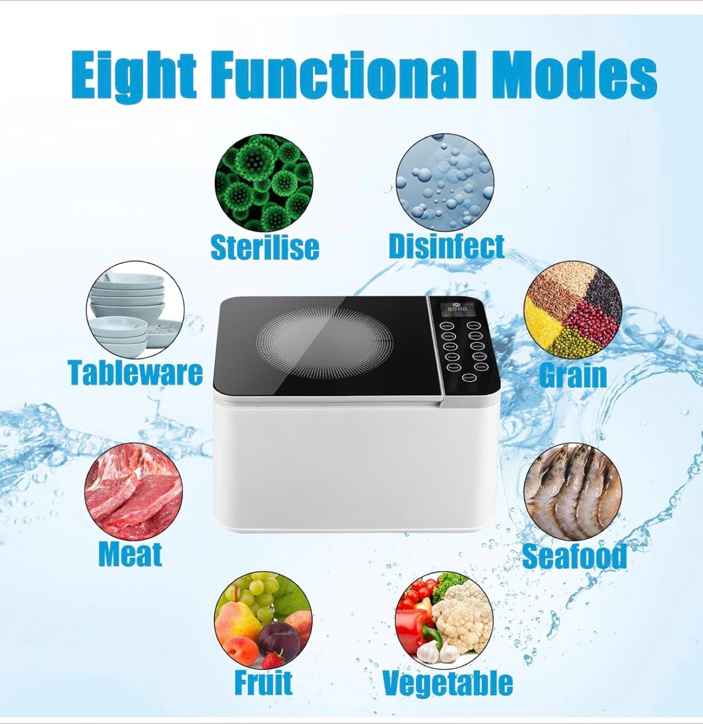 I'm selling a multifunctional food purifier and sterilizer. It has eight functional modes, including sterilize, disinfect, tableware, grain, meat, seafood, fruit, and vegetable. It's in great condition and ready to help keep your food clean and safe!