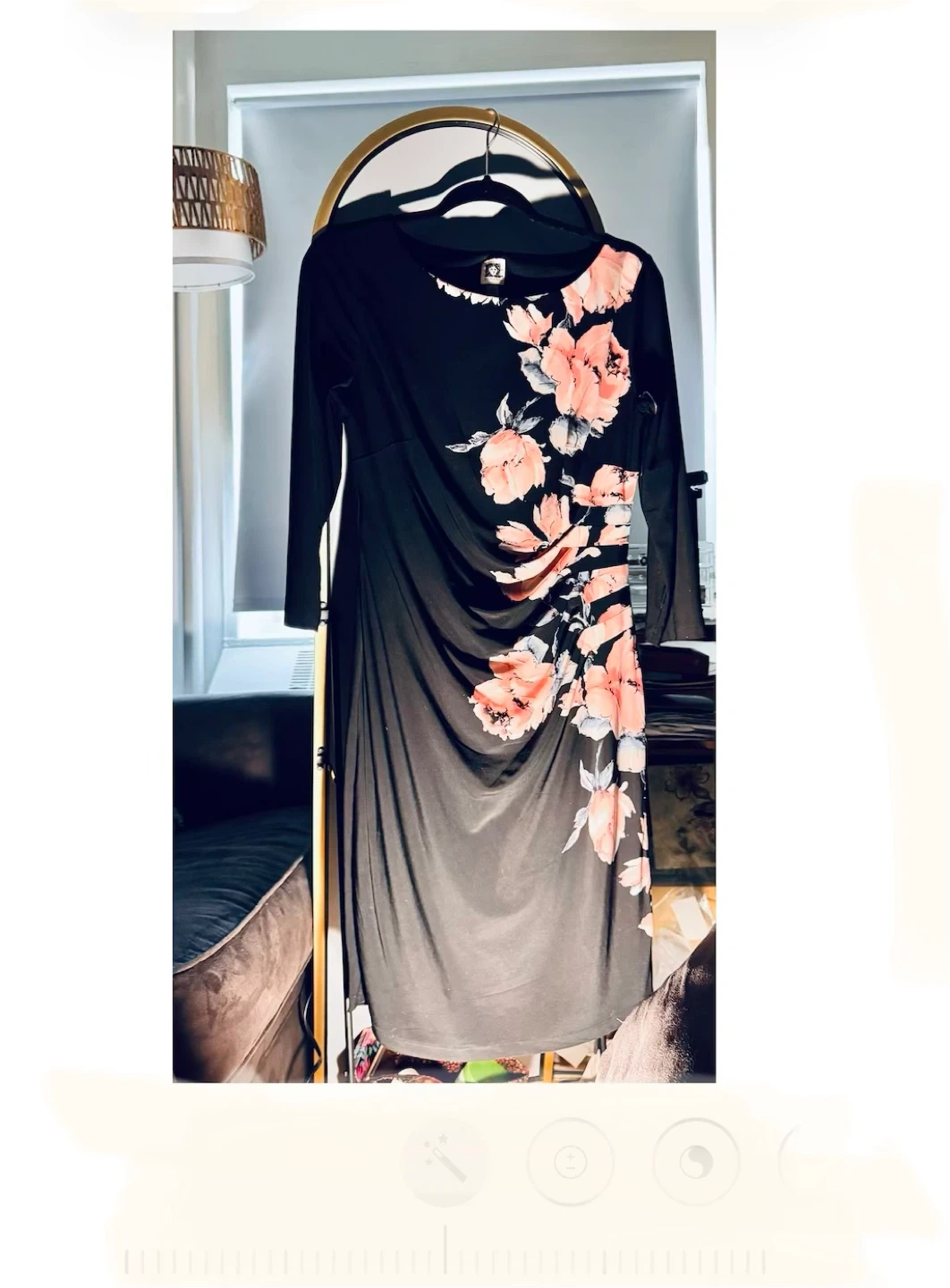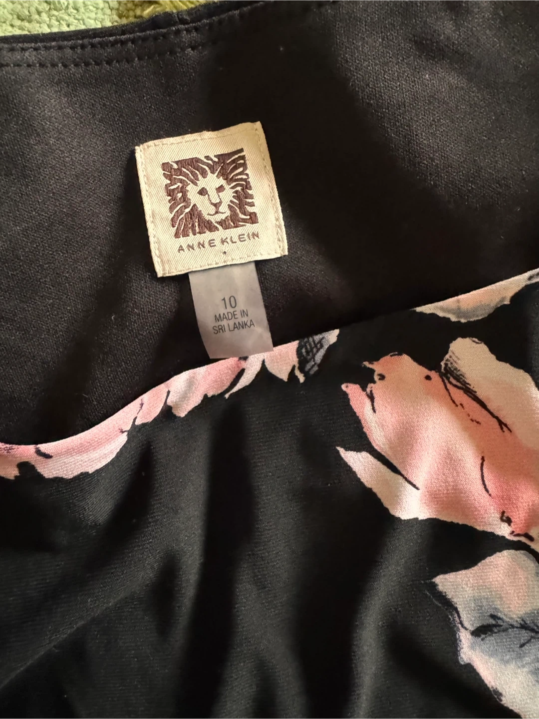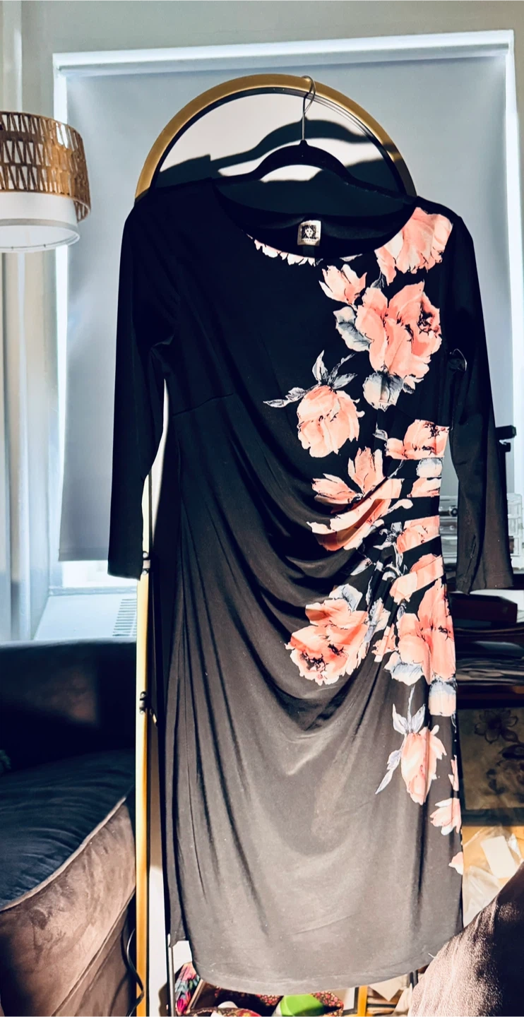 Anne Klein black dress with a floral print. Features ruched detailing on the side. Made in Sri Lanka. Machine wash cold.