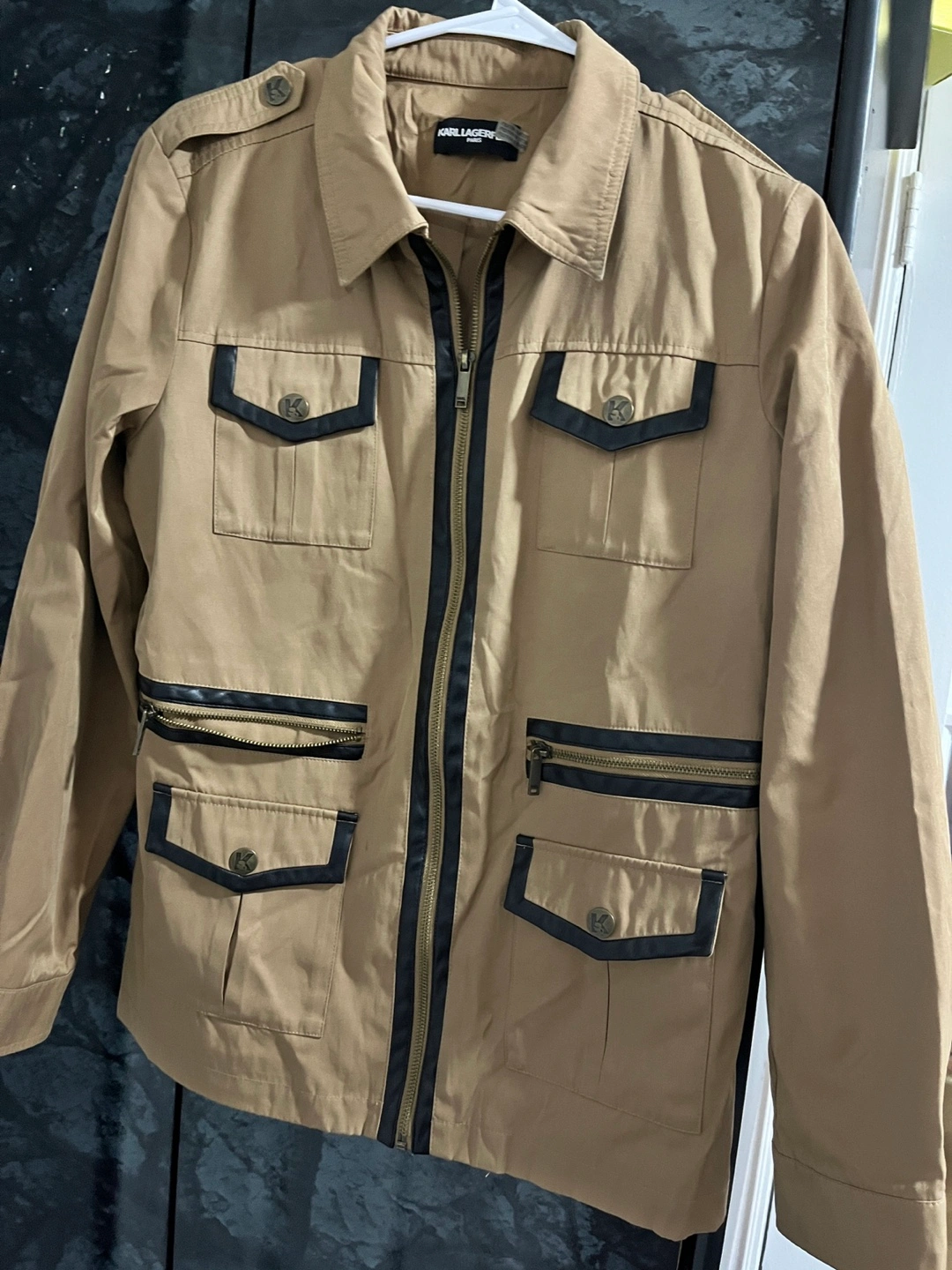 Selling a Karl Lagerfeld jacket in a nice beige colour! It features black accents and a stylish design with multiple pockets. It's in great condition and perfect for adding a touch of sophistication to your wardrobe