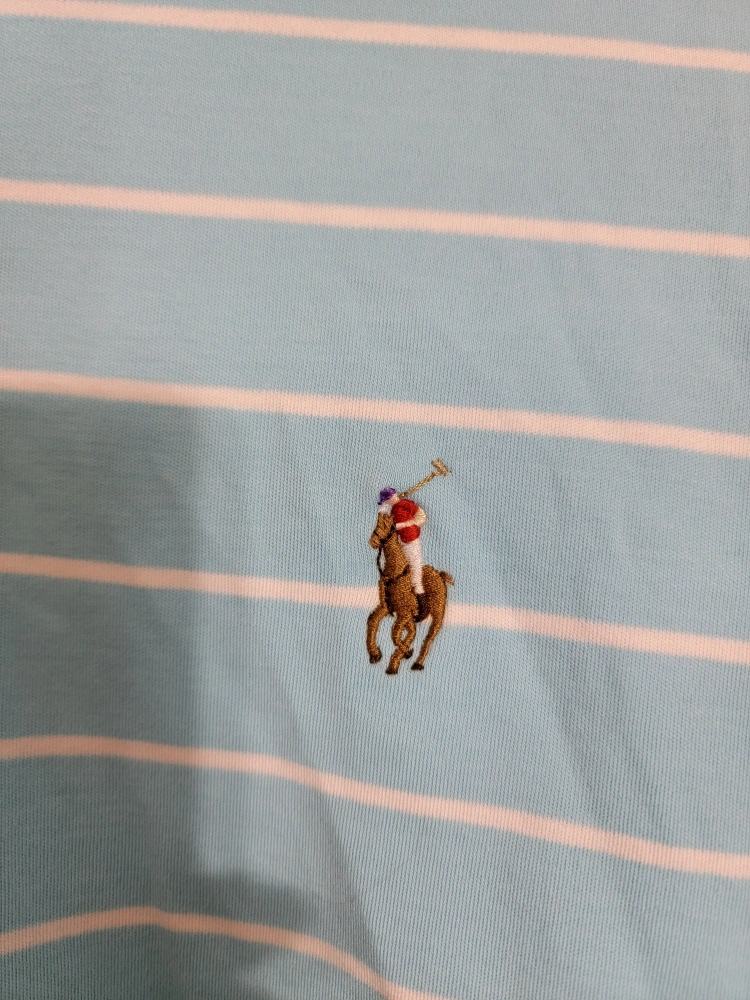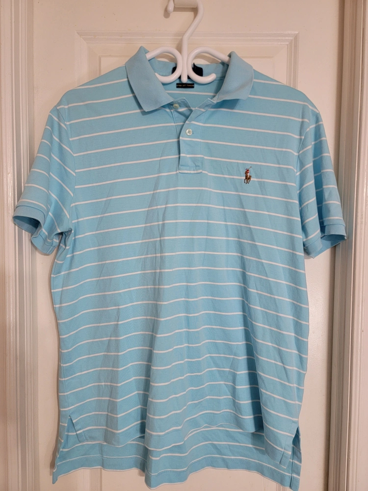 Men's light blue and white striped polo shirt. Short sleeves. Classic fit. Polo Ralph Lauren branding. Pima Soft Touch material.