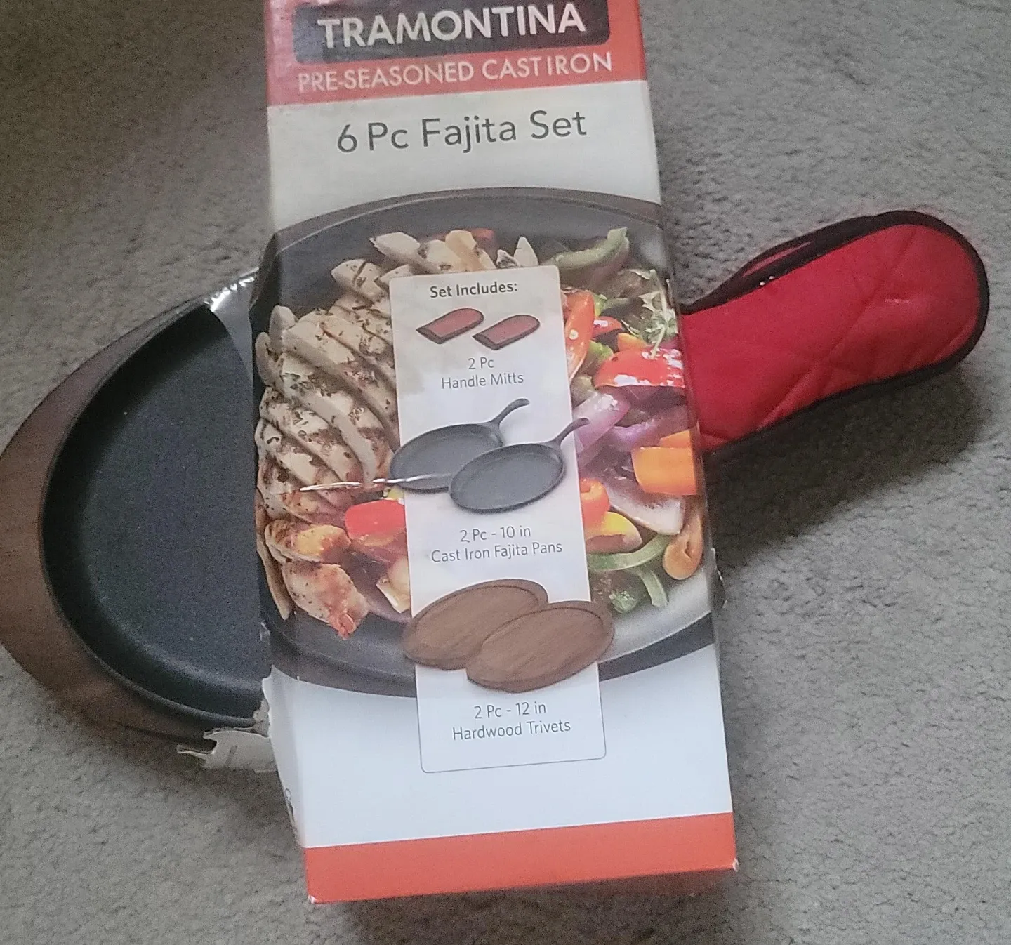 This is a 6-piece fajita set from Tramontina. It includes 2 pre-seasoned cast iron fajita pans, 2 hardwood trivets, and 2 handle mitts. Pans are 10 inches and trivets are 12 inches.