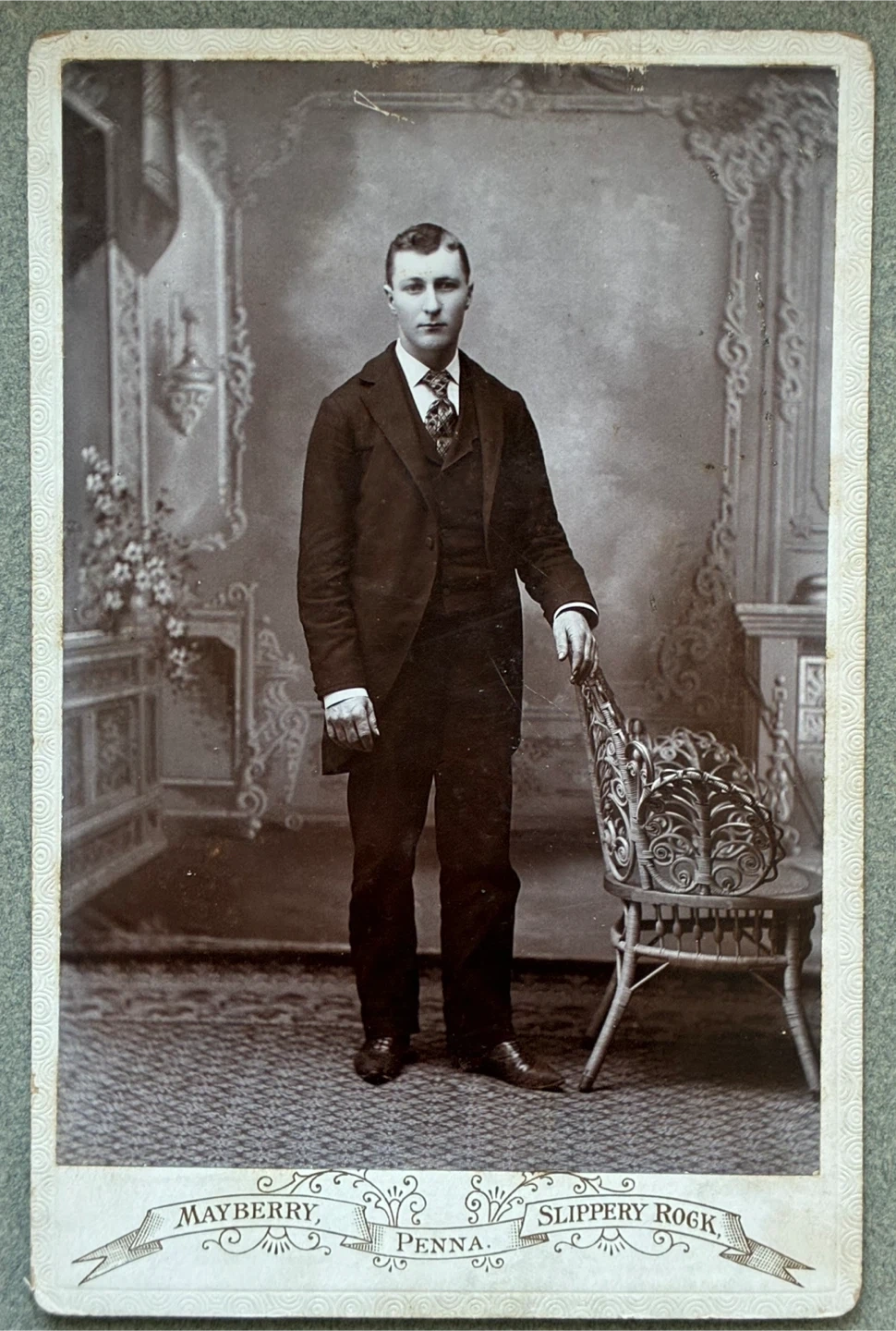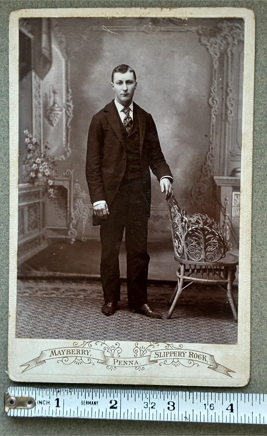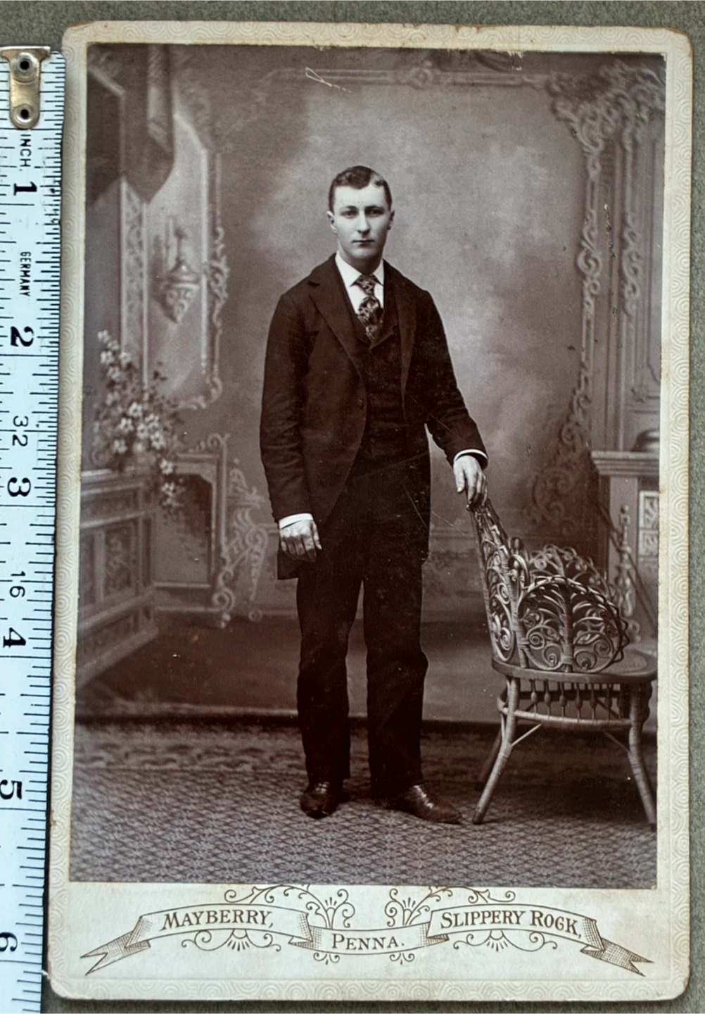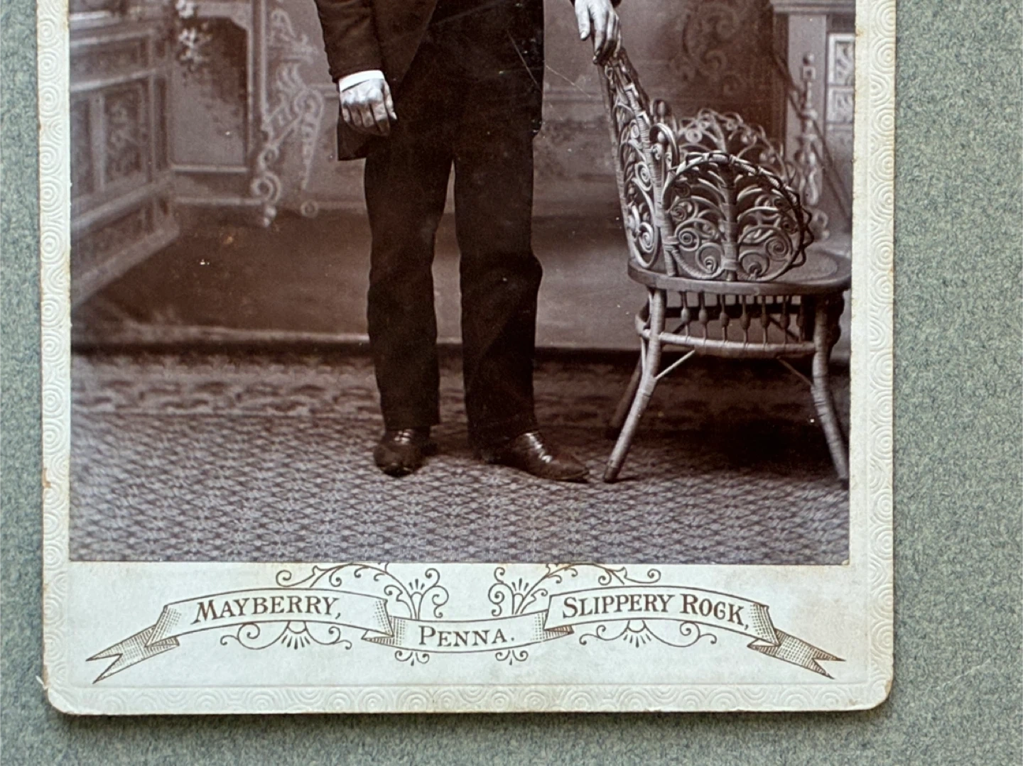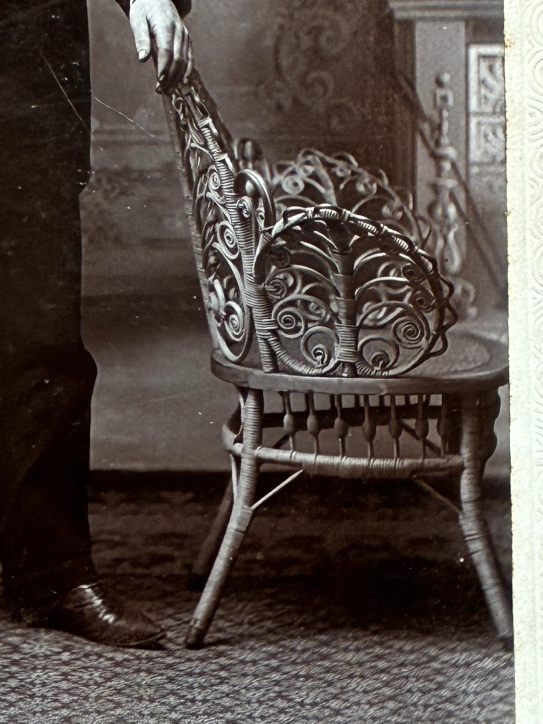 Antique 1800s cabinet card man photo photograph portrait vintage clothes and wonderful wicker rattan chair
