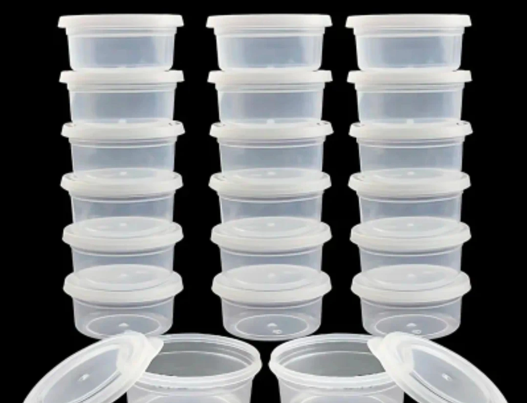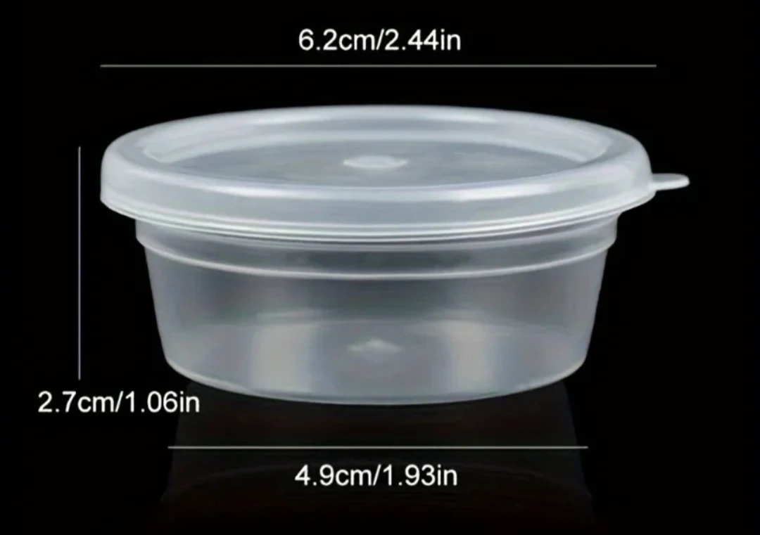 A set of 36 clear plastic containers with secure lids. Each container measures approximately 6.2cm in diameter and 2.7cm in height. Great for storing small craft supplies or food portions!
