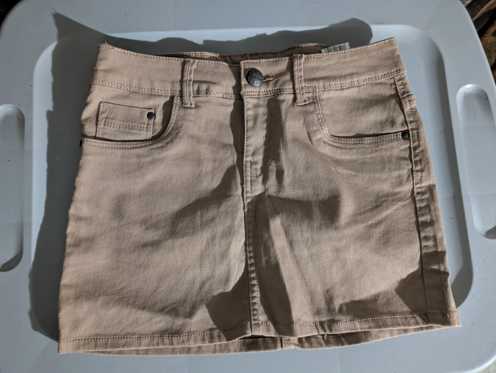 Here's a cute tan denim mini skirt! It's in great condition and ready for a new home. The material is sturdy and perfect for casual outings or dressing up. It features classic denim styling with pockets and a comfortable fit