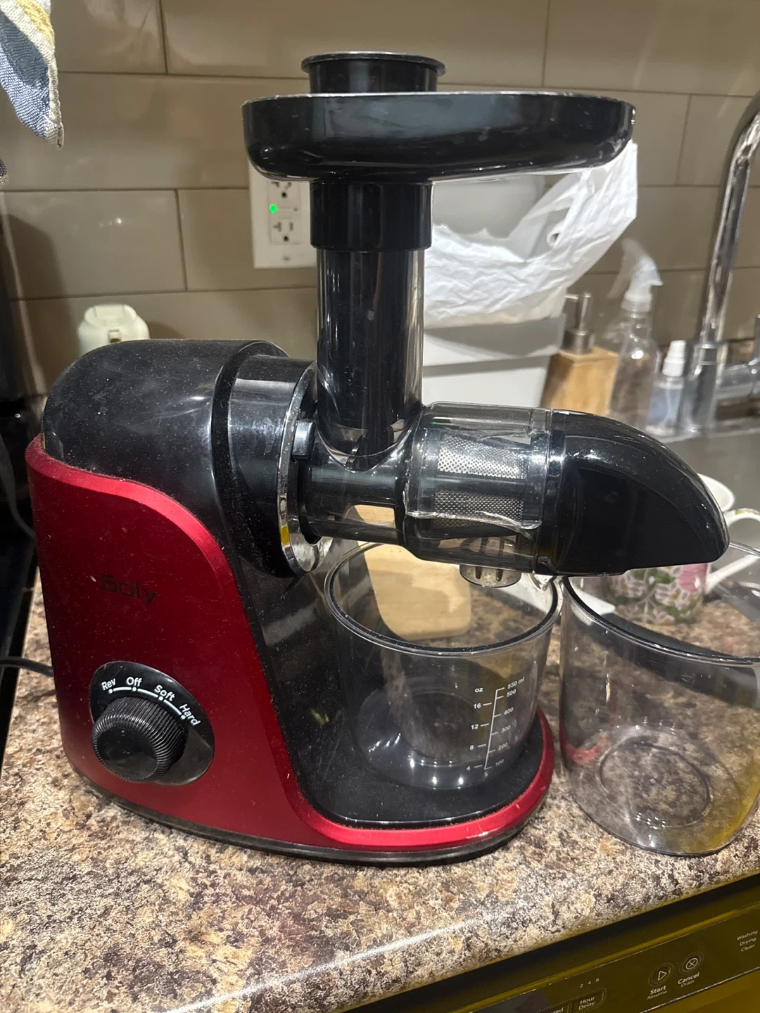 This is a red and black Soly slow juicer. It has controls for 'Rev', 'Off', 'Soft', and 'Hard'. Includes pulp and juice containers.