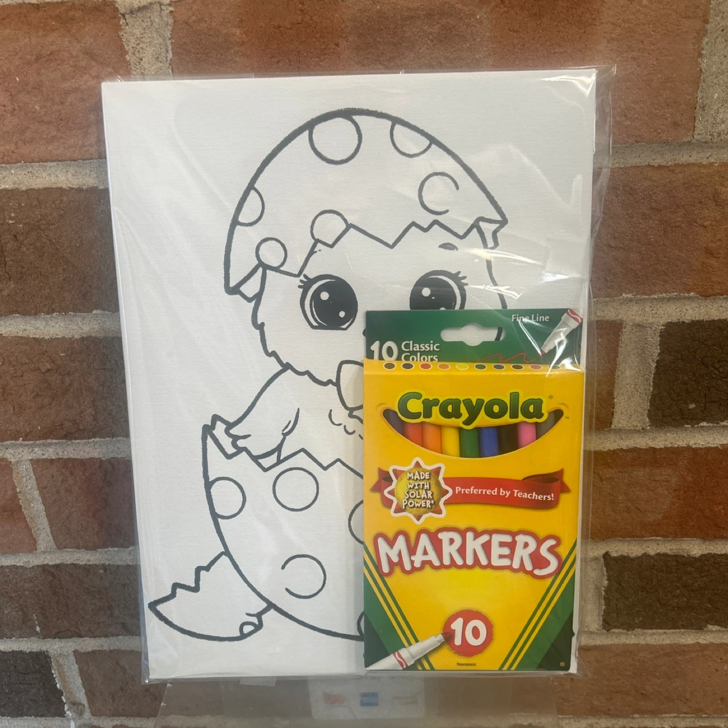 This is a fun canvas painting kit featuring a cute chick hatching from an egg. It includes a set of 10 Crayola Classic Colors fine line markers. Perfect for young artists to create their own masterpiece!