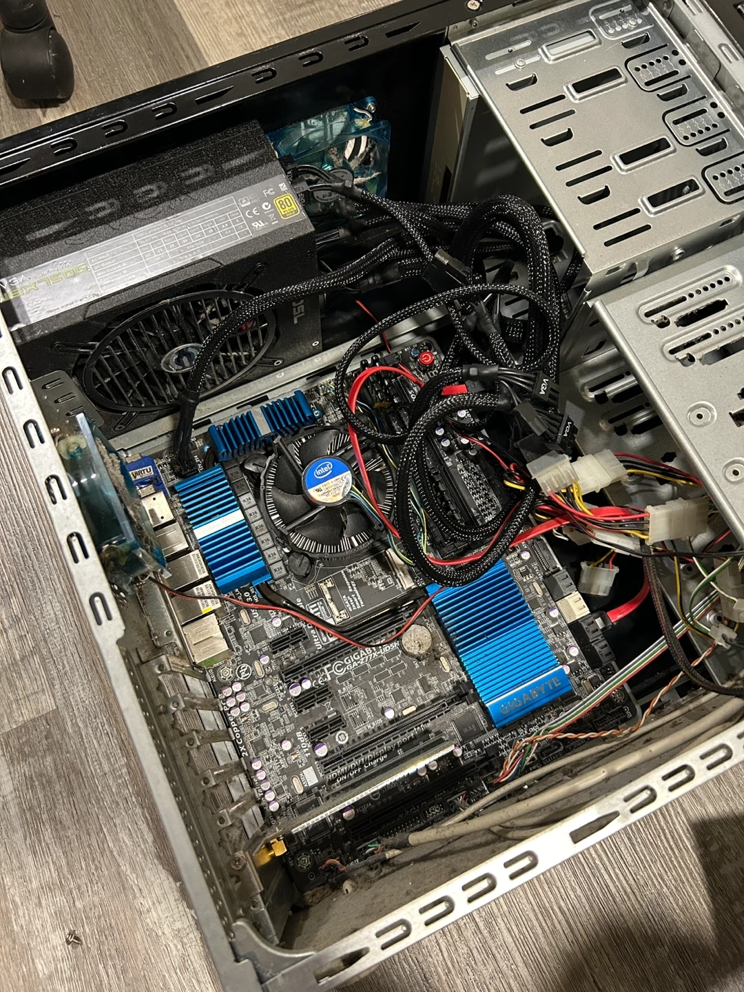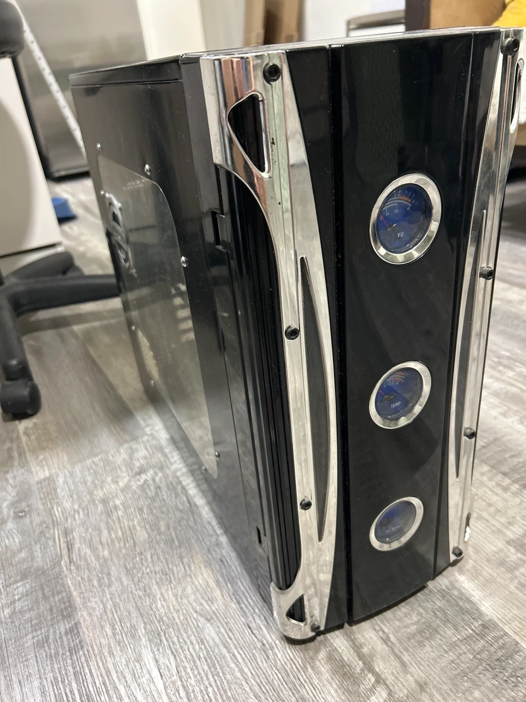 This is a custom-built PC tower featuring an EVGA Supernova NEX750G power supply. It's housed in a black case with chrome accents and VU meters on the front. Ready for your custom build or upgrades! Budget PC 16gb RAM i5 3gen and EVGA NEX750G Power Supply and WIFI NO HD AS IS
