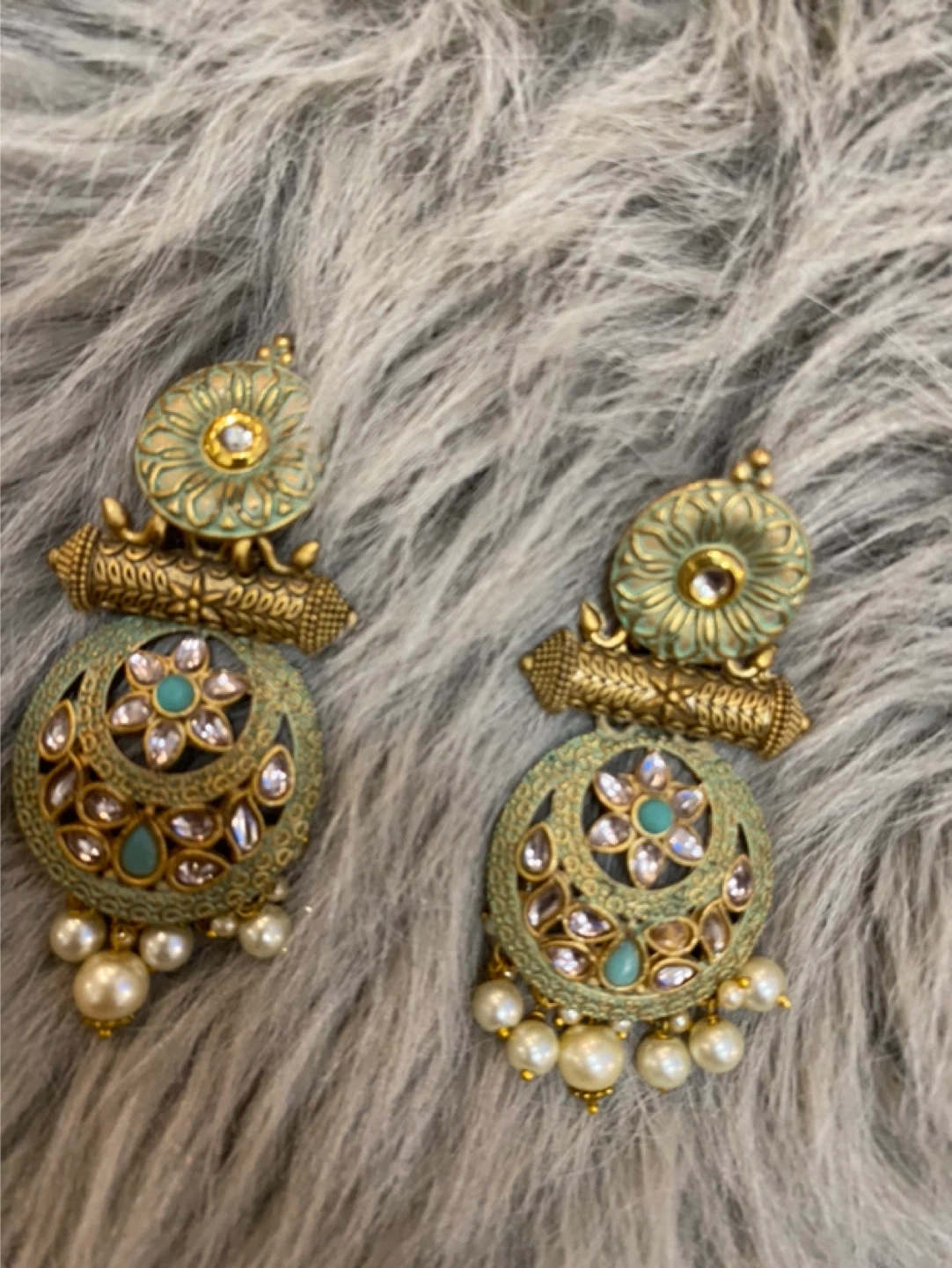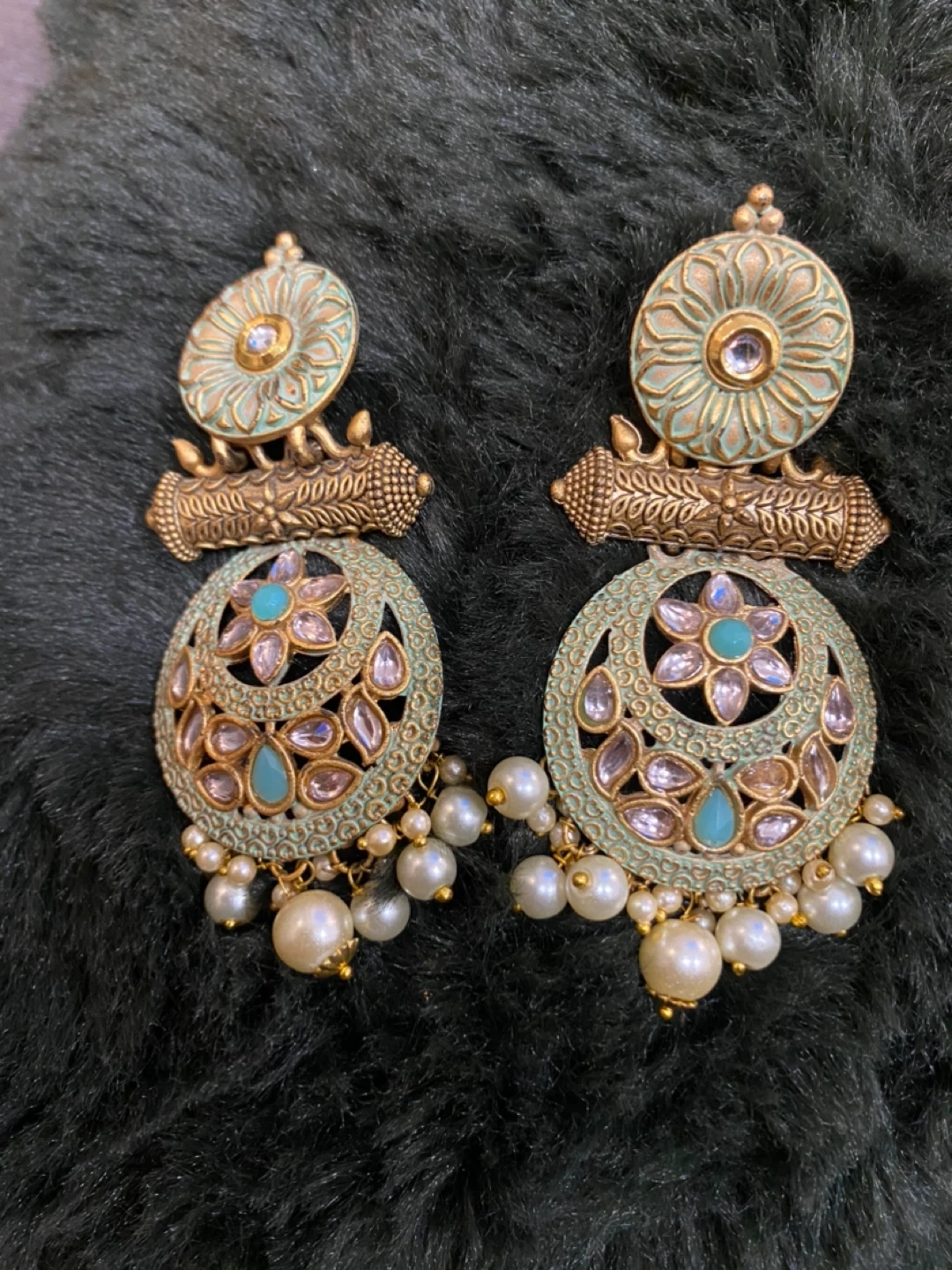 These beautiful earrings have a vintage-inspired design with intricate gold detailing and a mint green accent. They feature faux pearls and rhinestones. Perfect for adding a touch of elegance to any outfit!