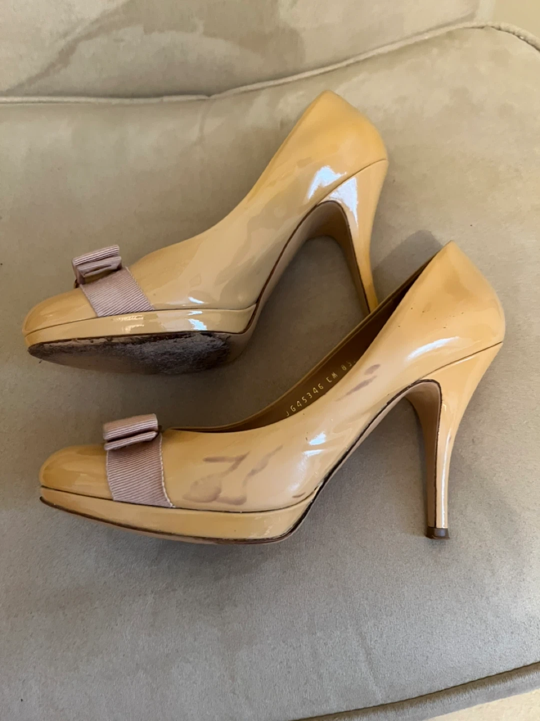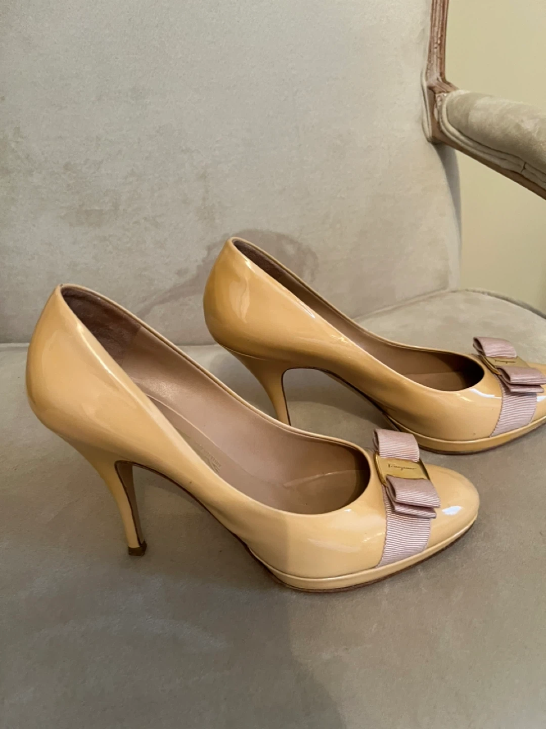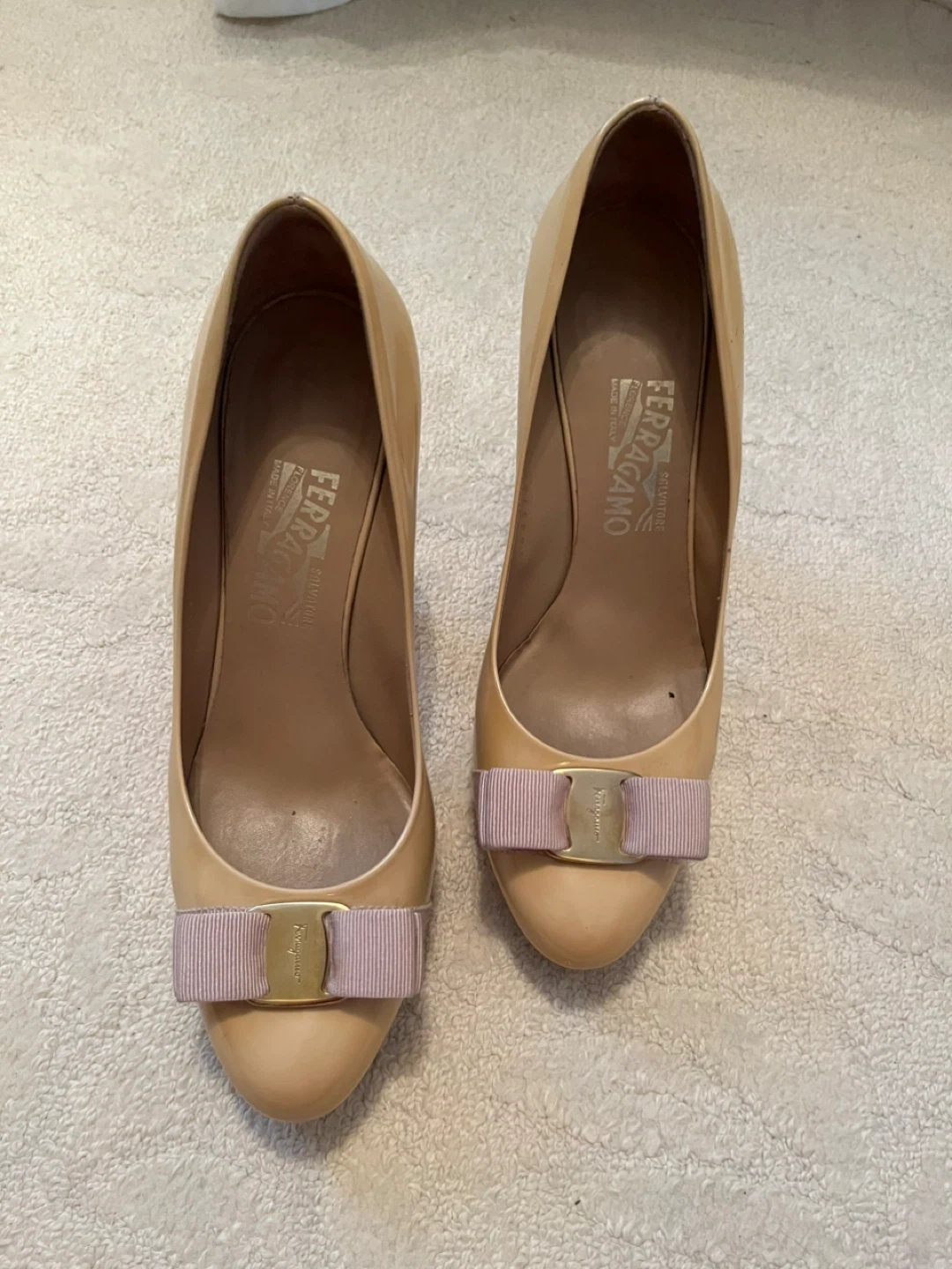 These Salvatore Ferragamo heels are a classic nude patent leather. Please note one shoe has scuff marks. Price reflects that.