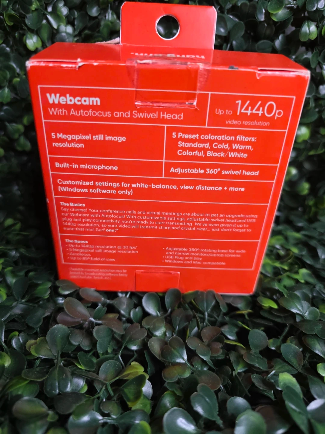 This onn. webcam offers up to 1440p video resolution with autofocus and a built-in microphone. It features an adjustable 360° swivel head for optimal positioning. Comes with 5 Megapixel still image resolution and 5 preset color filters.