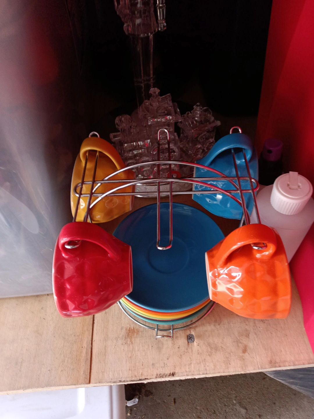 A colorful coffee cup set with a metal stand. It includes matching saucers and cups in various colors. A nice item to enjoy espresso or some tea in. Only 4 cups & 6 plates. Pickup in Maspeth Queens.