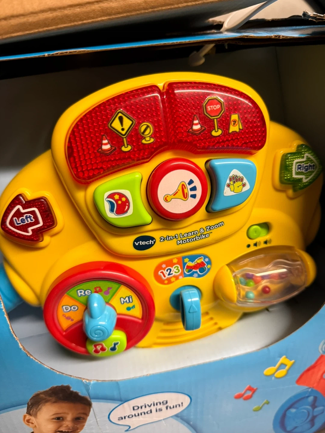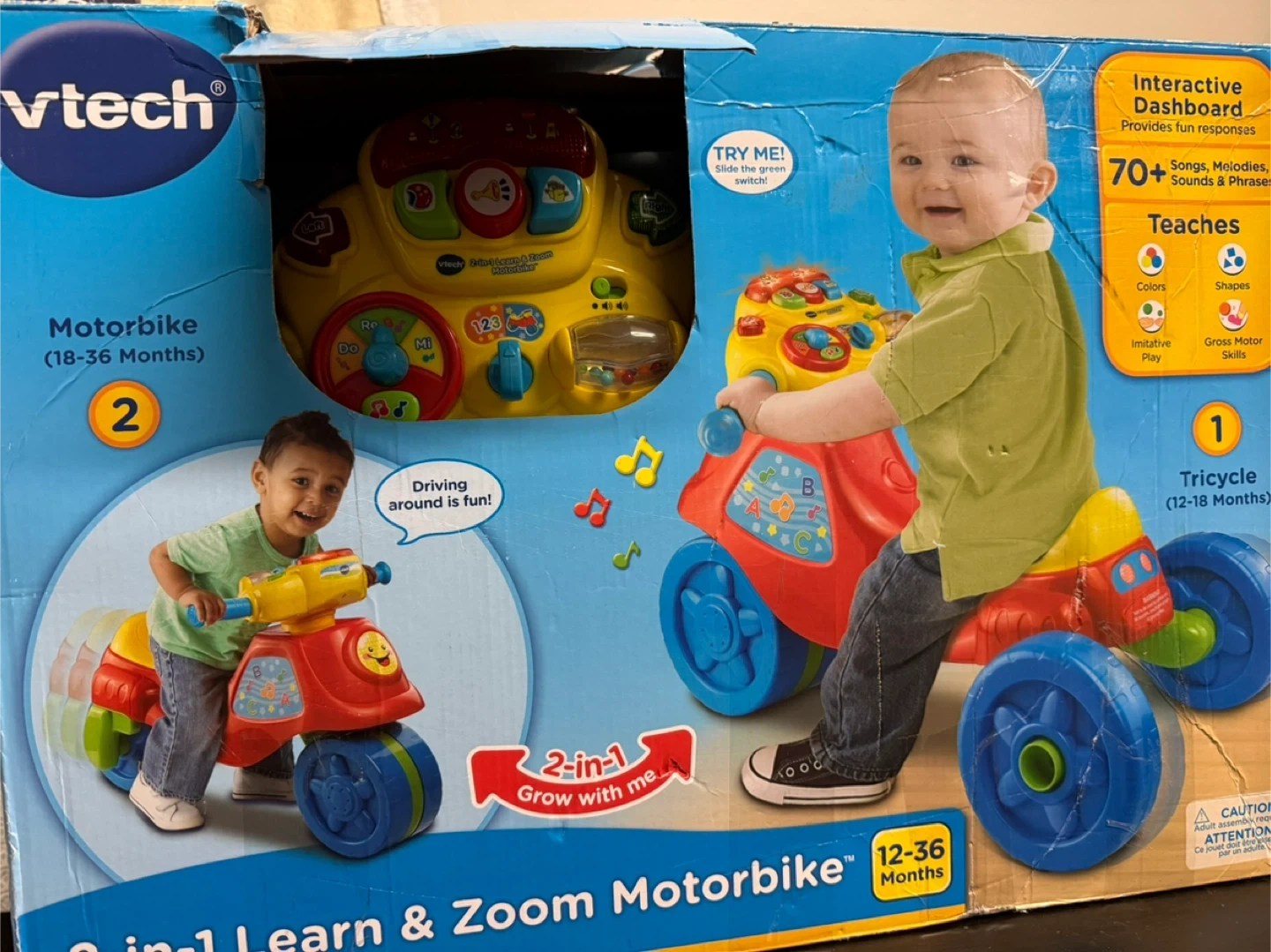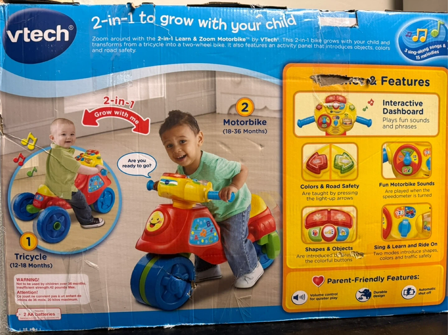 Zoom around with the VTech 2-in-1 Learn & Zoom Motorbike! This 2-in-1 bike grows with your child and transforms from a tricycle into a two-wheel bike. It also features an activity panel that introduces objects, colors and road safety. It grows with your child and includes an interactive dashboard that plays fun sounds and phrases