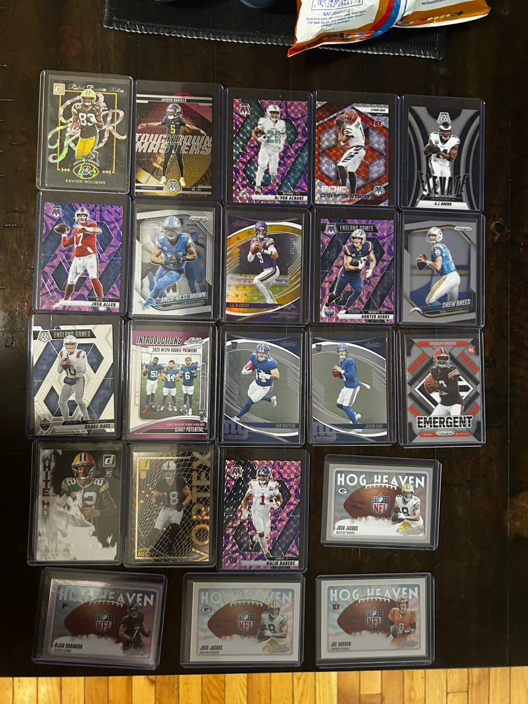 A collection of National Football League trading cards featuring various players. The cards are from different sets and brands, including Mosaic and Donruss. They're housed in protective sleeves.