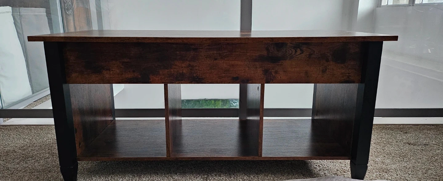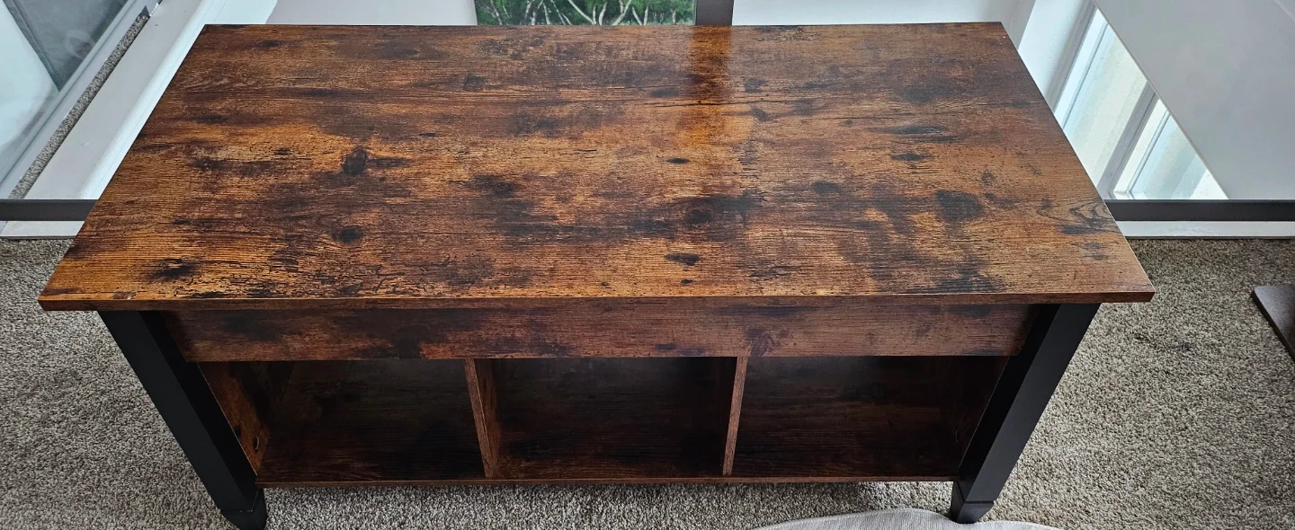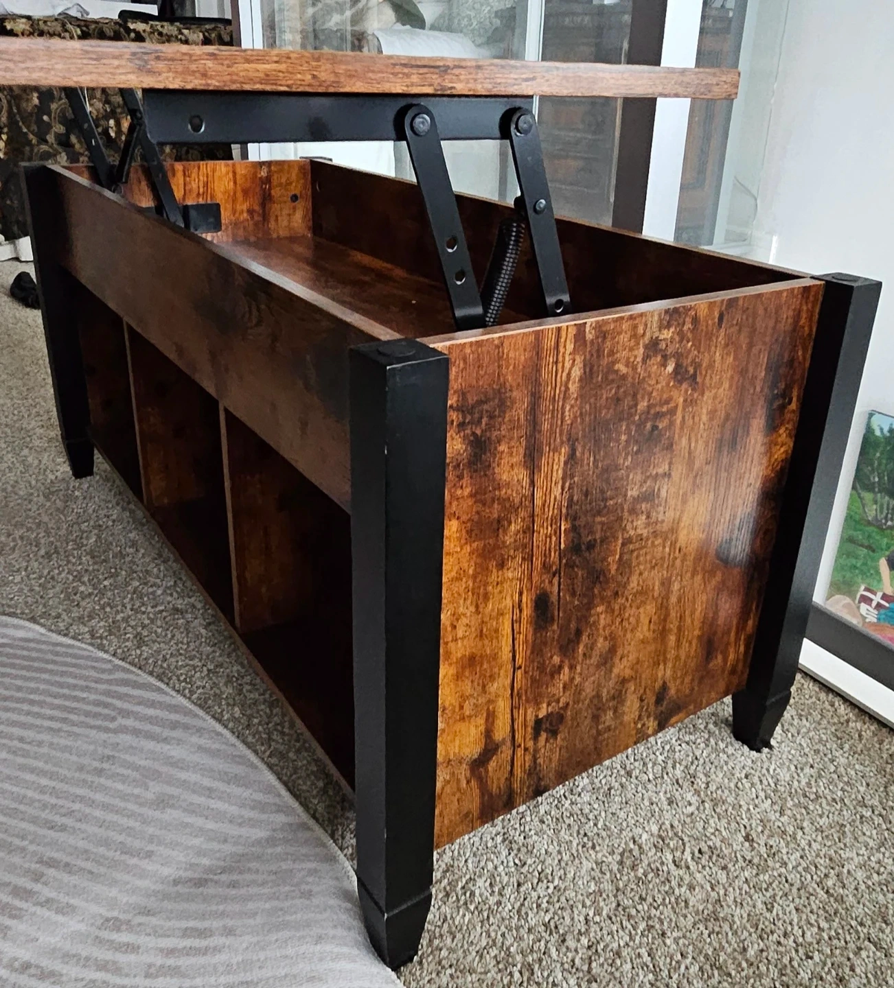 This rustic-style coffee table features a lift-top mechanism for convenient access. It has three open cubbies for storage. The top is a wood-grain finish with black legs and accents.
