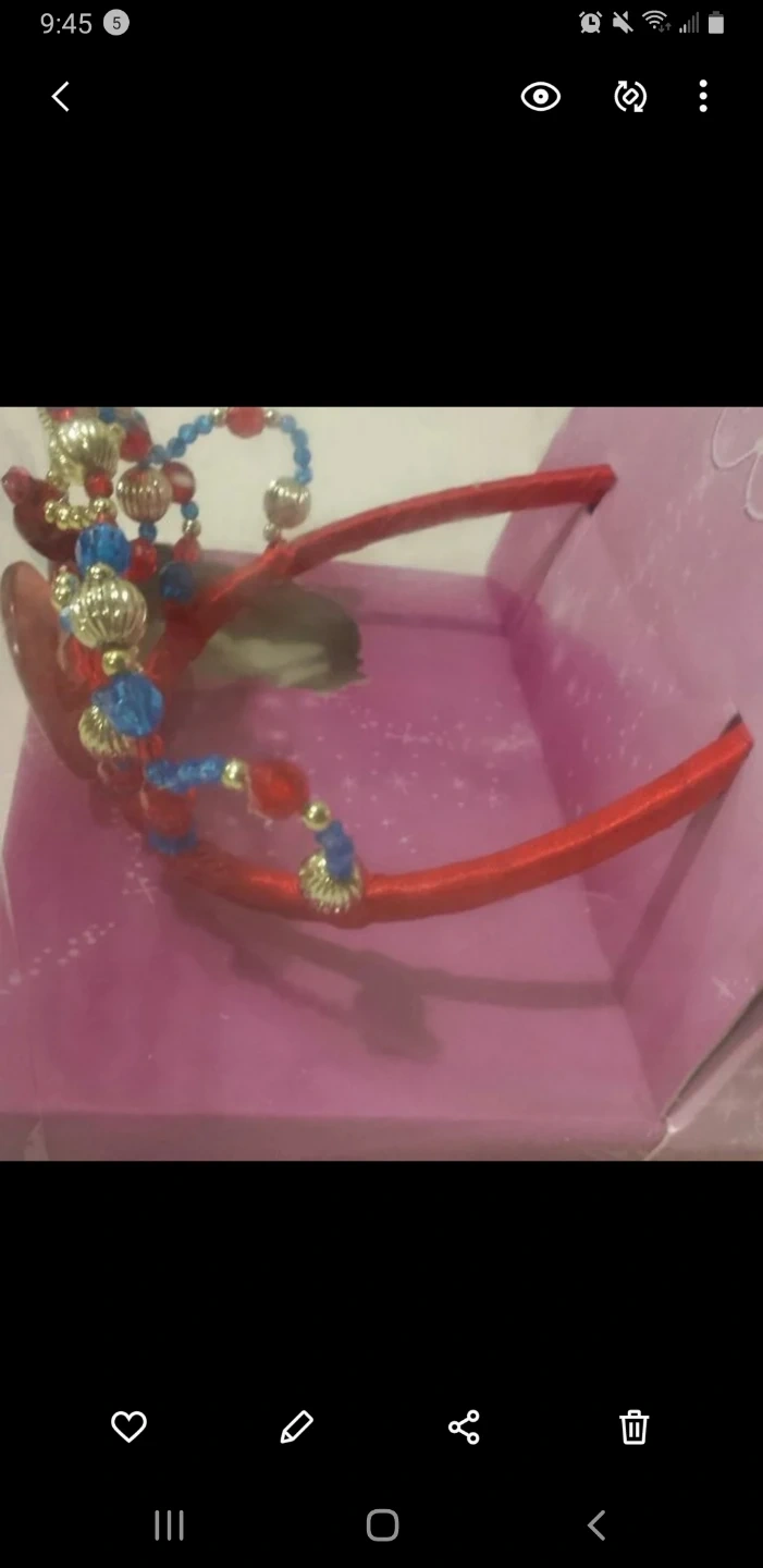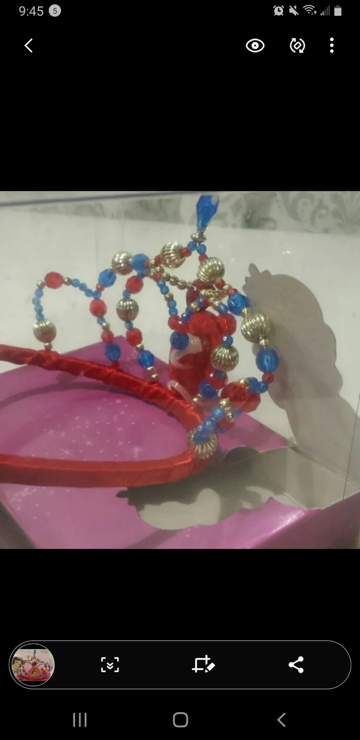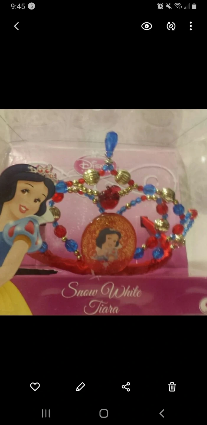 This tiara is decorated with red and blue beads and gold-colored accents. It features an image of Snow White in the center. It's designed for children's dress-up play. Sparkly and fun!