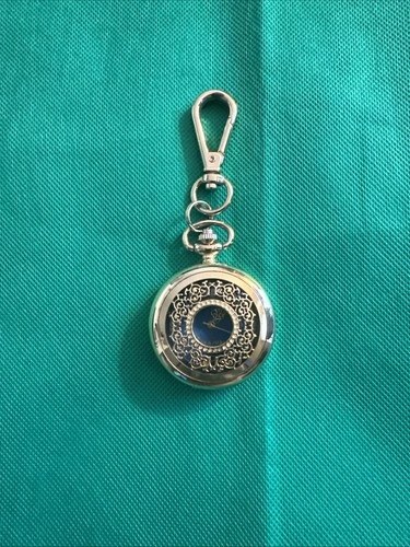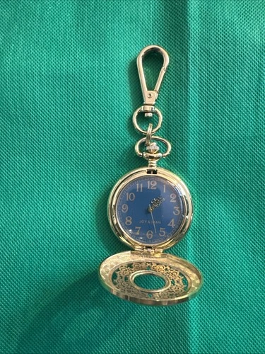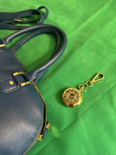 The Joy & Iman Blue Pebbled Leather Satchel is a stylish and versatile handbag perfect for multiple occasions. Made from high-quality leather with a pebbled finish, this medium-sized bag features a semi-circle shape, zip closure, and double ivory handles. The gold hardware adds a touch of elegance, while the interior is lined with polyester, satin, and fabric materials. With inner pockets, a mobile phone pocket, and a cross-body strap included, this designer handbag is a must-have. The pocket watch works and is in excellent condition.